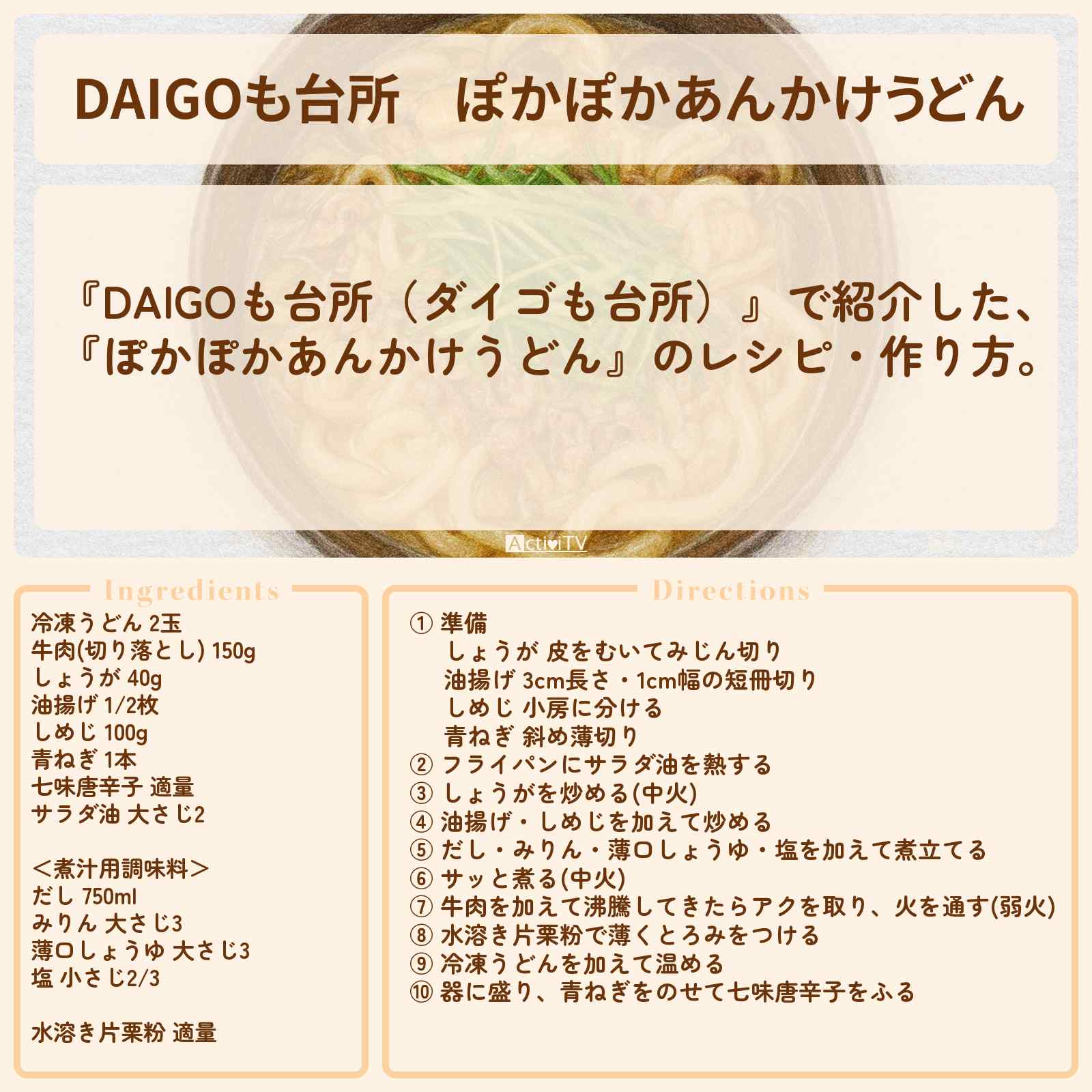 放送の【DAIGOも台所(ダイゴも台所)】で紹介した、『ぽかぽかあんかけうどん』のレシピ・作り方。