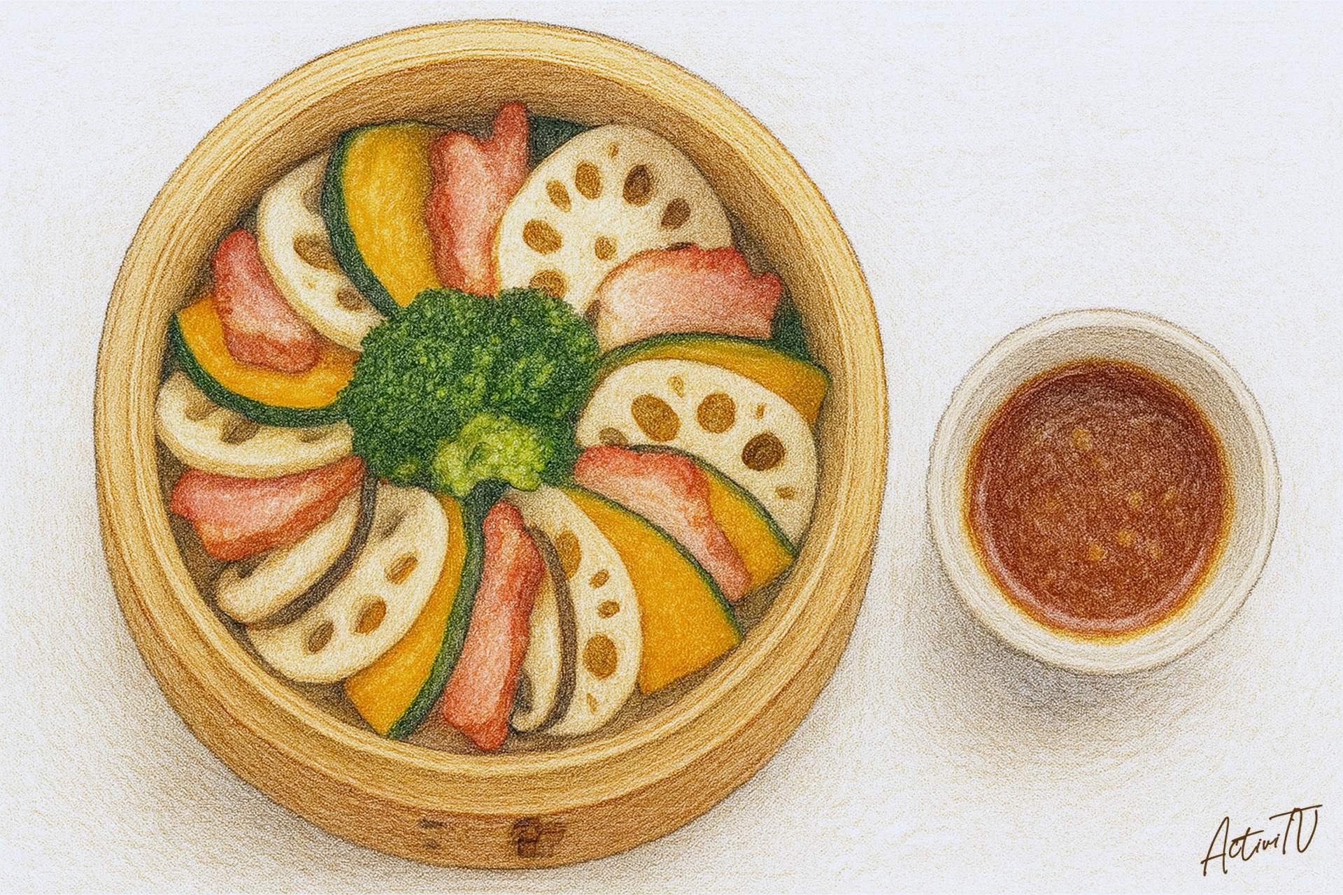 2025年12月1日放送の【DAIGOも台所(ダイゴも台所)】で紹介した、『野菜のセイロ蒸し 辛味ごまソース』のレシピ・作り方。