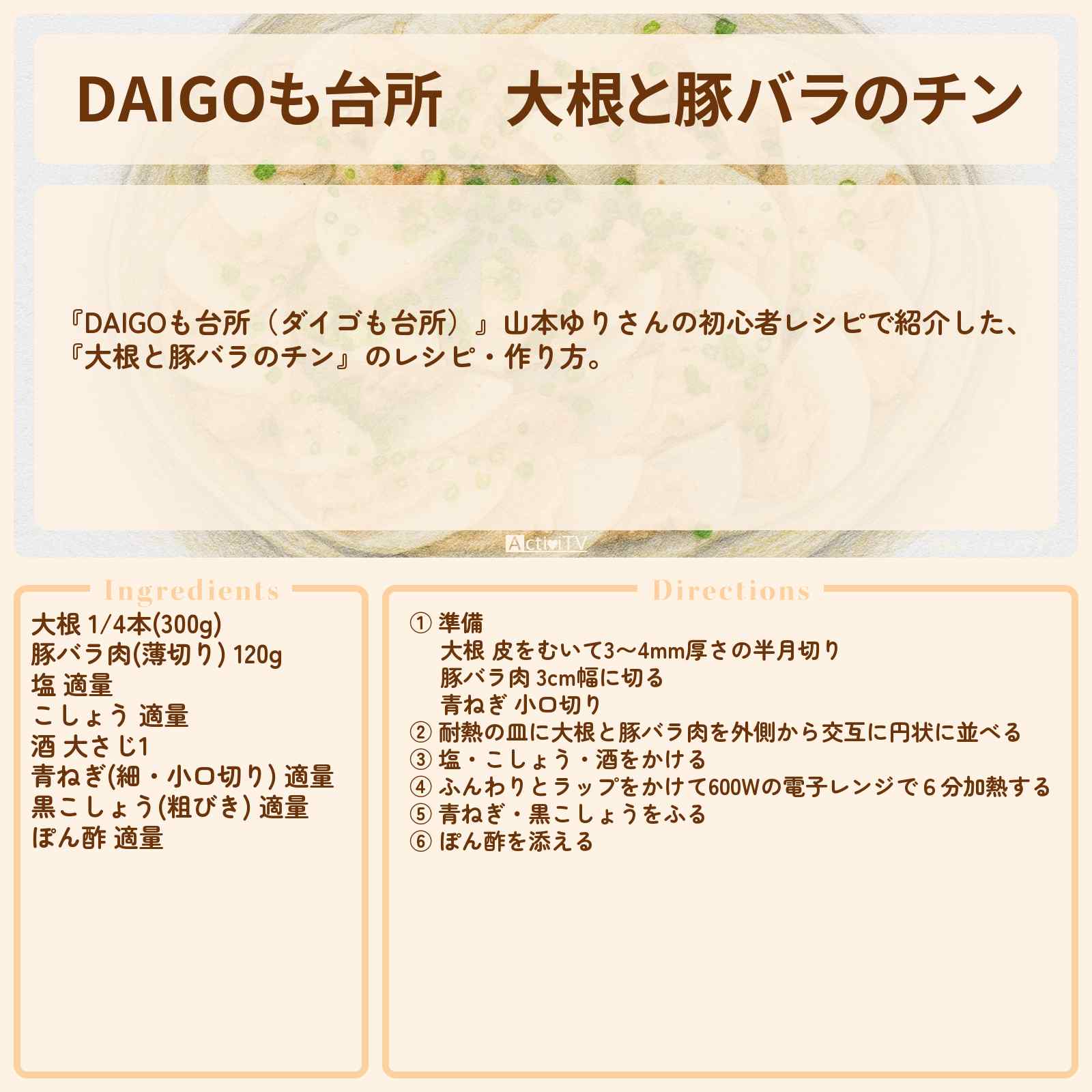 放送の【DAIGOも台所(ダイゴも台所)】山本ゆりさんの初心者レシピで紹介した、『大根と豚バラのチン』のレシピ・作り方。