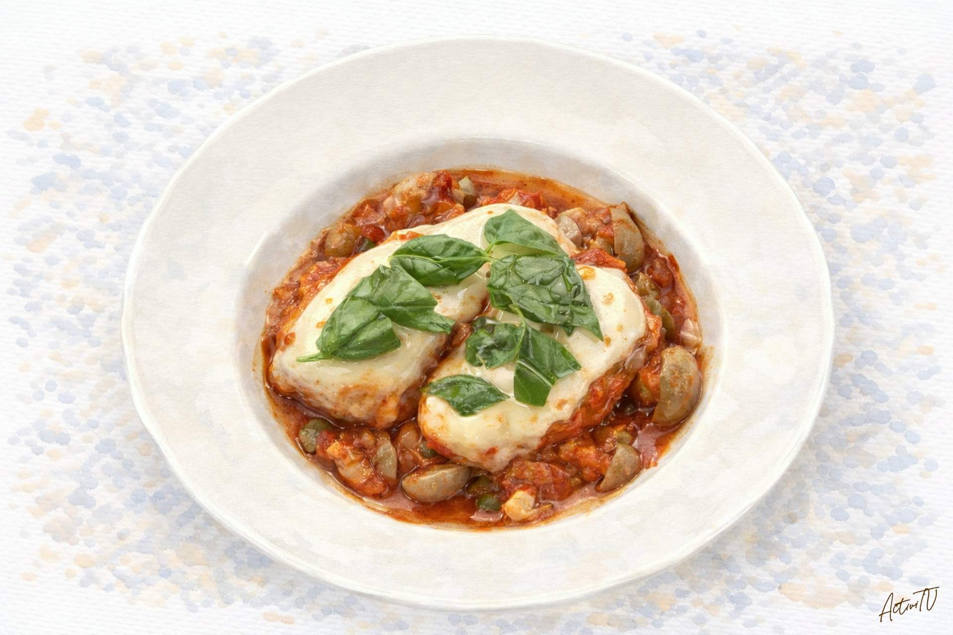 豚ヒレ肉を軽くたたいて粉をまとわせ、表面は香ばしく、中はしっとり仕上げるトマト煮込みです。にんにくと赤唐辛子の香りを移したオリーブ油で焼き色をつけ、きのこの旨みとケイパーの酸味をトマトソースに重ねて奥行きを出します。