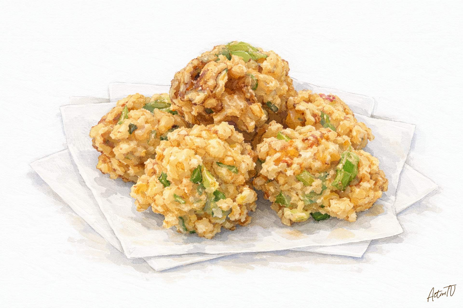 春の香りがふわっと立つ、旬素材のかき揚げです。むきえびは包丁で叩いて粘りを出すことで、衣と具がまとまりやすくなり、ひと口サイズでも崩れにくい仕上がりに。たけのこの食感、そら豆のほくっとした甘み、木の芽の爽やかな香りが一体となって、軽やかなのに満足感のある味わいになります。