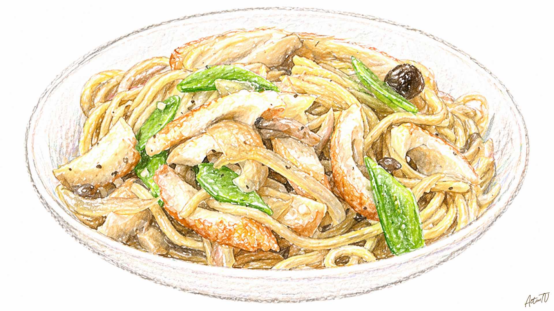 ちくわ・ しめじ・ 玉ねぎ・ きぬさや・ にんにく・ 黒こしょう・ 中華麺・ サラダ油・ 鶏ガラスープ・ し...