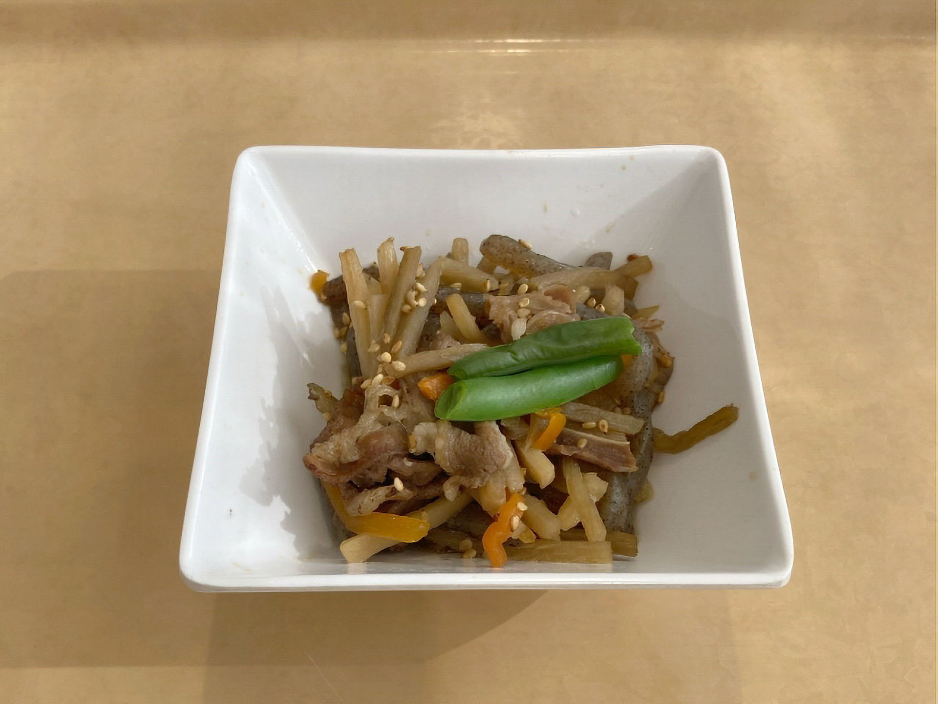 - 熱したフライパンにオリーブ油を引きごぼうを入れ中火で3分炒める