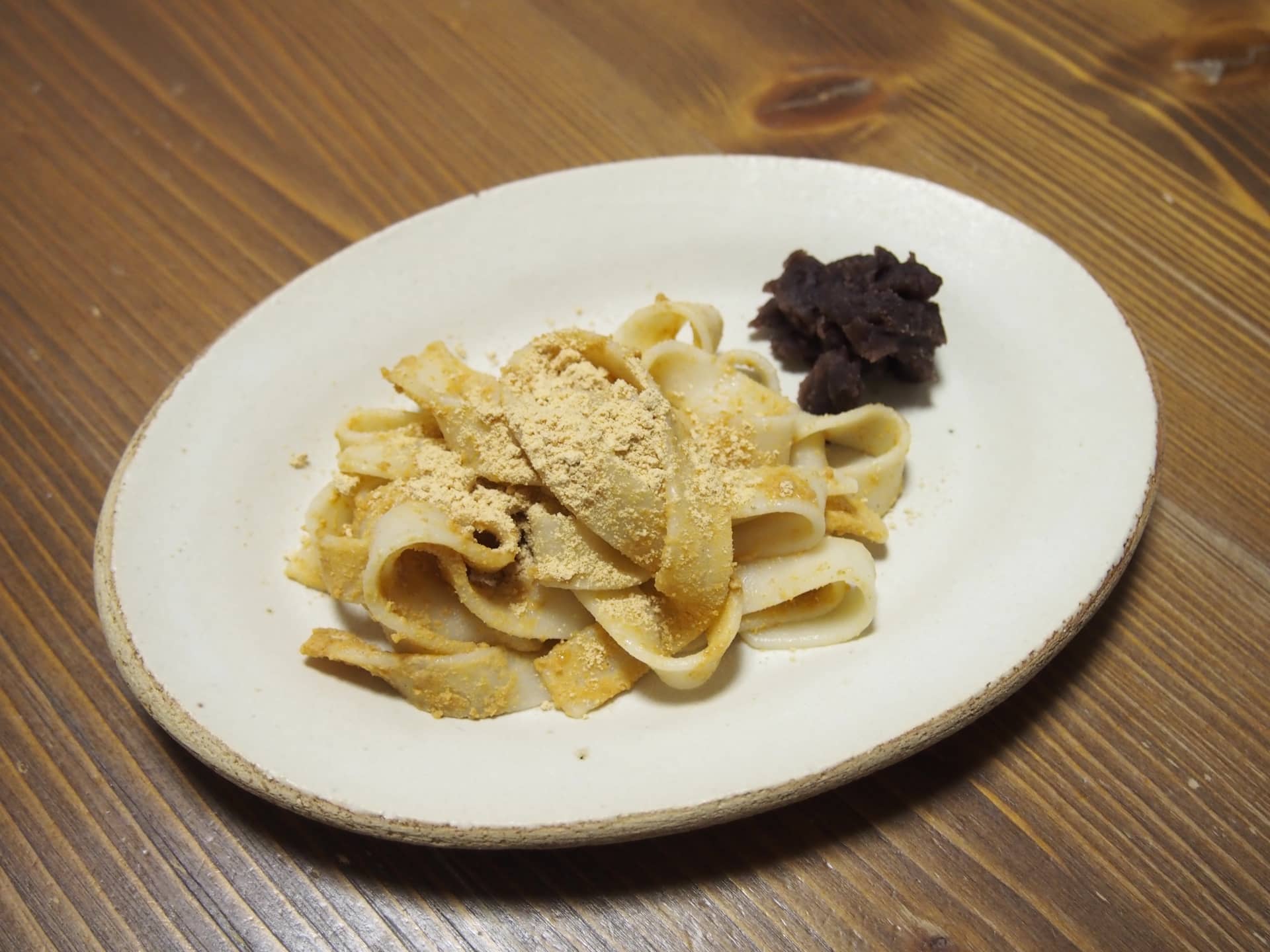 小麦粉で作った平たい麺状のものにきなこと砂糖をまぶして食べるおやつ感覚の郷土料理です。