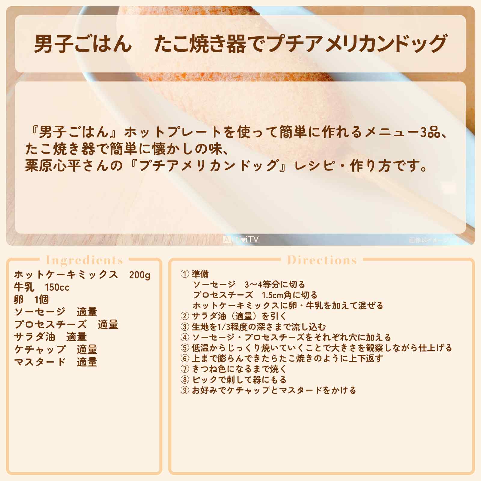 放送の【男子ごはん】ホットプレートを使って簡単に作れるメニュー3品、たこ焼き器で簡単に懐かしの味、栗原心平さんの『プチアメリカンドッグ』レシピ・作り方です。