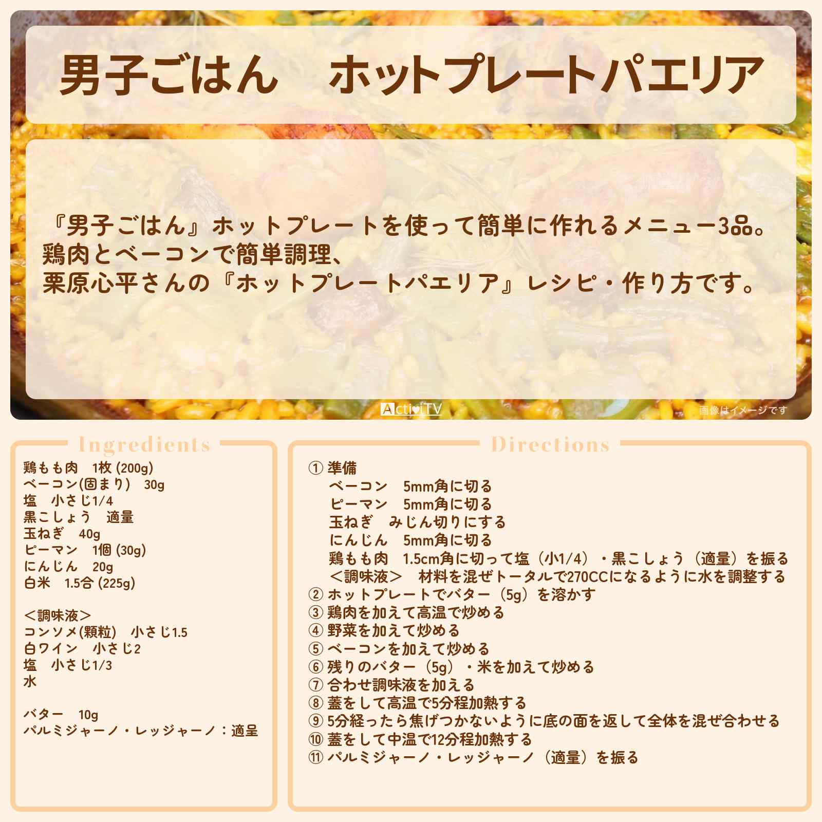 放送の【男子ごはん】ホットプレートを使って簡単に作れるメニュー3品。鶏肉とベーコンで簡単調理、栗原心平さんの『ホットプレートパエリア』レシピ・作り方です。