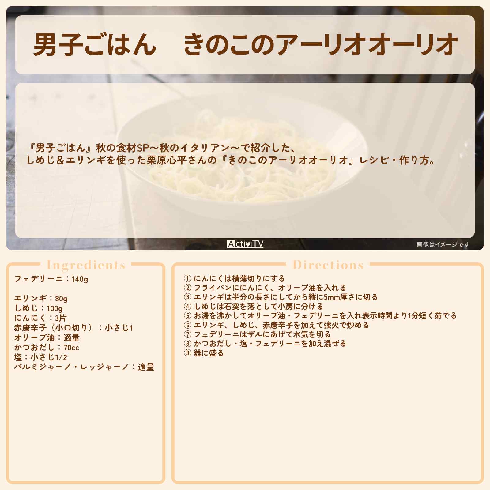 放送の【男子ごはん】秋の食材SP〜秋のイタリアン〜で紹介した、しめじ&エリンギを使った栗原心平さんの『きのこのアーリオオーリオ』レシピ・作り方。