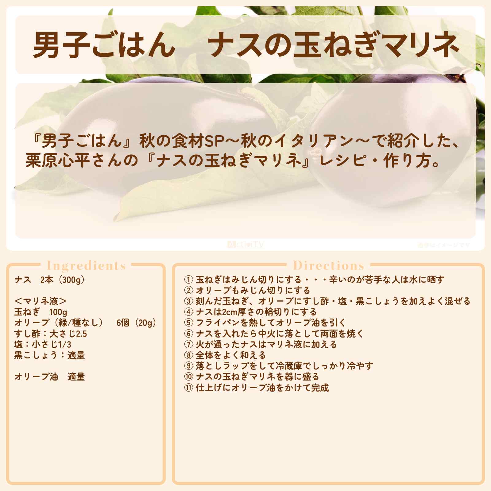 放送の【男子ごはん】秋の食材SP〜秋のイタリアン〜で紹介した、栗原心平さんの『ナスの玉ねぎマリネ』レシピ・作り方。