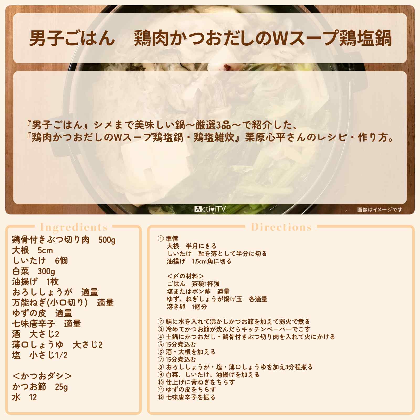 放送の【男子ごはん】シメまで美味しい鍋〜厳選3品〜で紹介した、『鶏肉かつおだしのWスープ鶏塩鍋・鶏塩雑炊』栗原心平さんのレシピ・作り方。