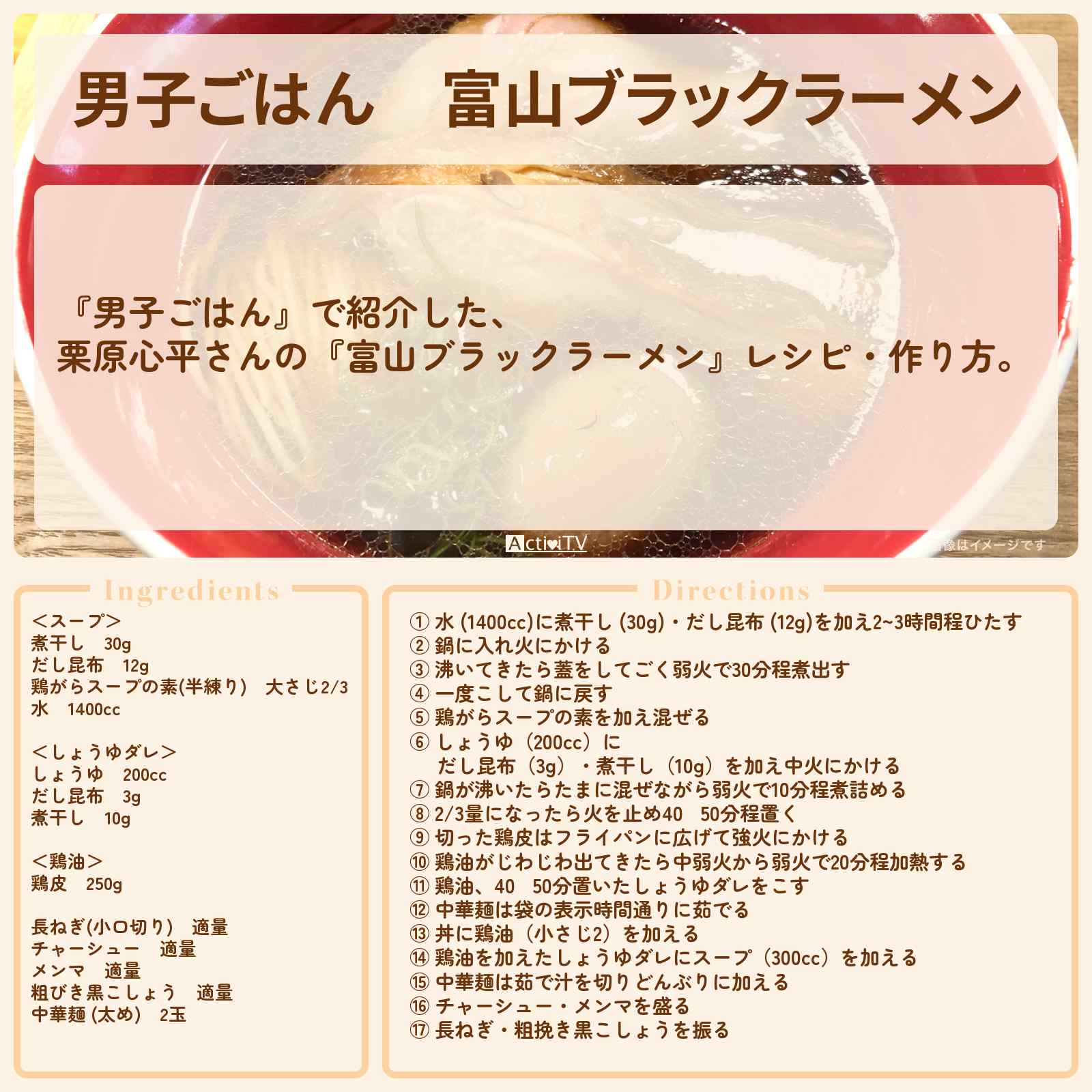 放送の【男子ごはん】で紹介した、栗原心平さんの『富山ブラックラーメン』レシピ・作り方。