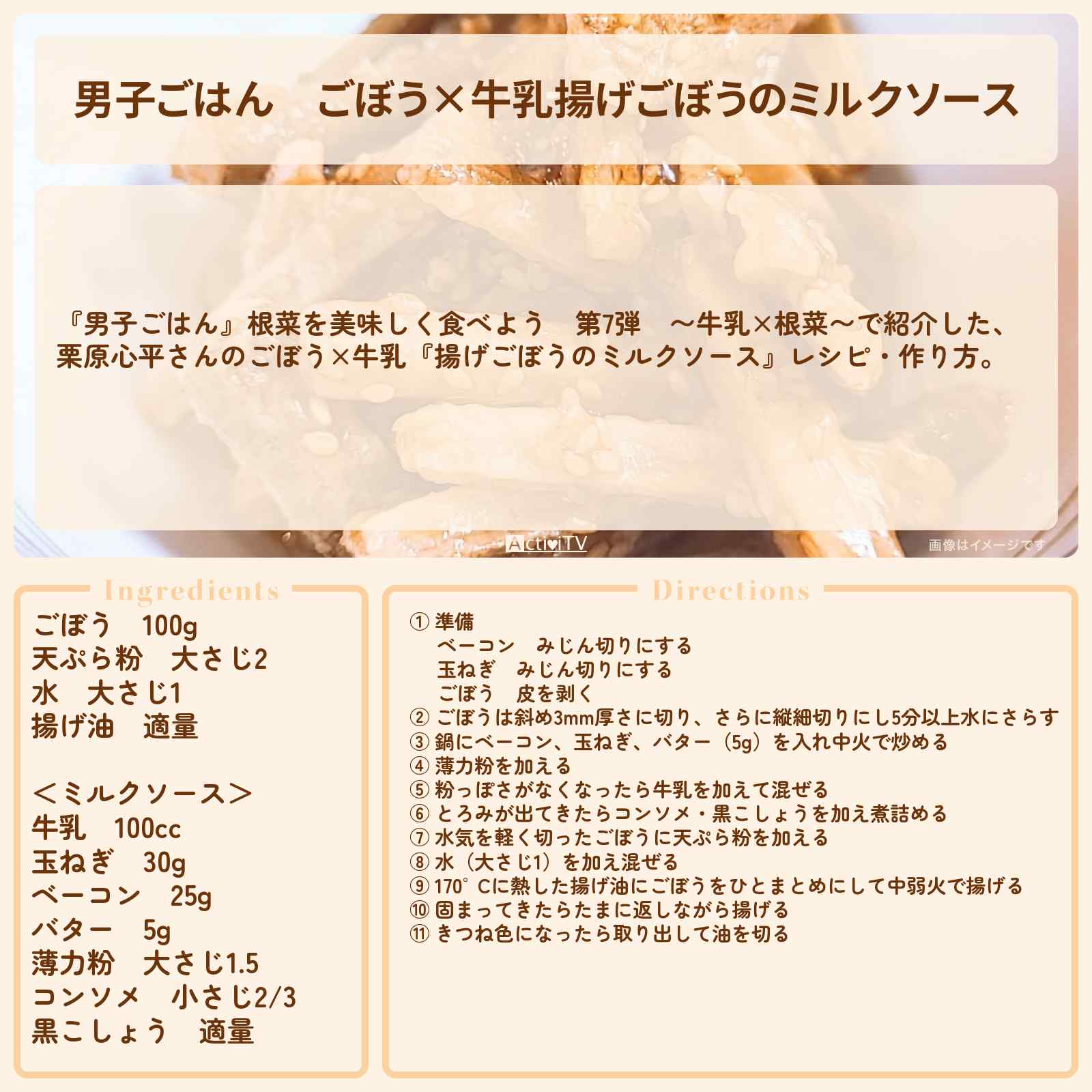 放送の【男子ごはん】根菜を美味しく食べよう 第7弾 〜牛乳×根菜〜で紹介した、栗原心平さんのごぼう×牛乳『揚げごぼうのミルクソース』レシピ・作り方。