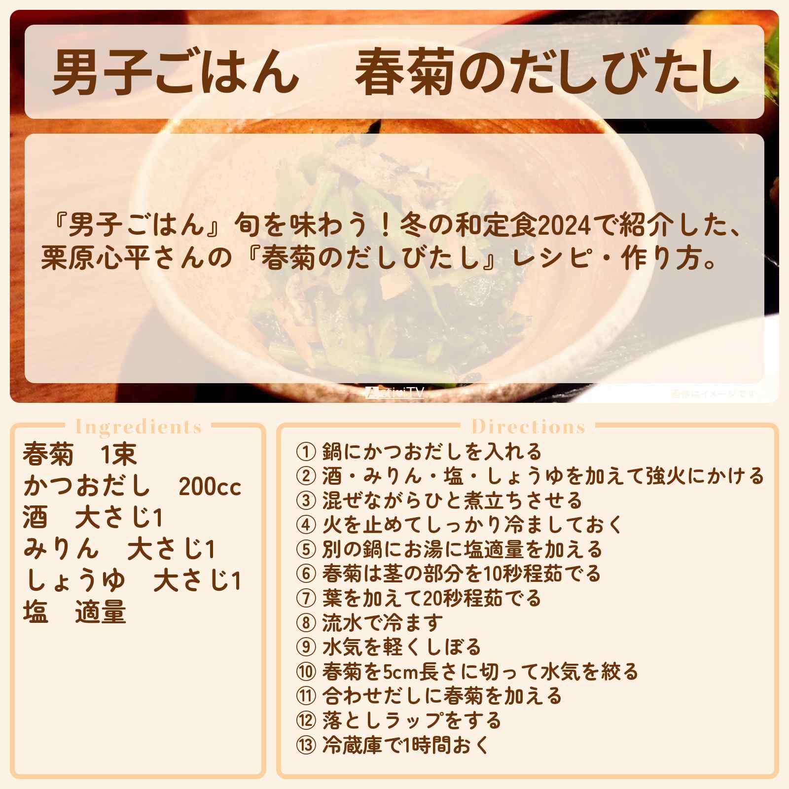 放送の【男子ごはん】旬を味わう!冬の和定食2024で紹介した、栗原心平さんの『春菊のだしびたし』レシピ・作り方。