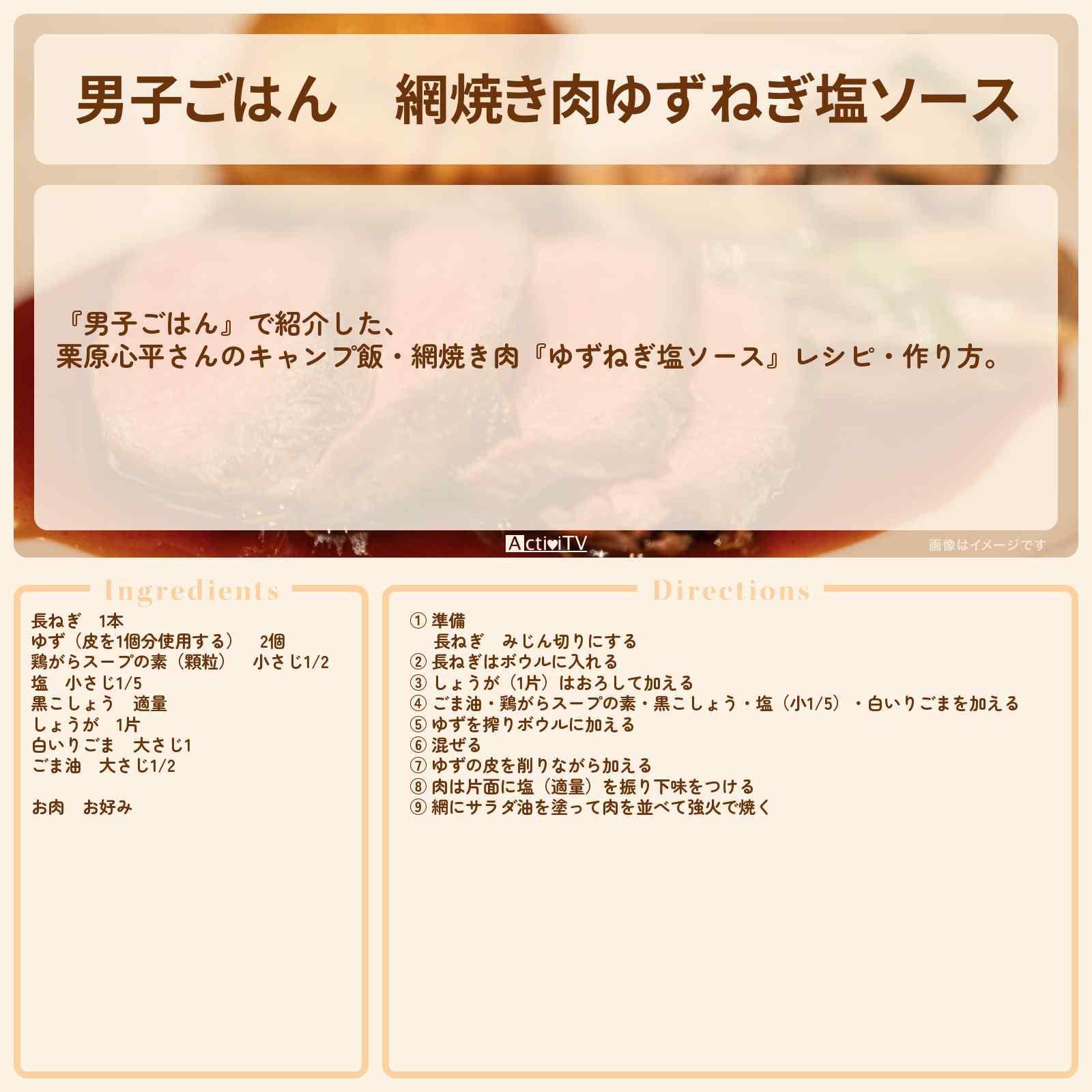 放送の【男子ごはん】で紹介した、栗原心平さんのキャンプ飯・網焼き肉『ゆずねぎ塩ソース』レシピ・作り方。