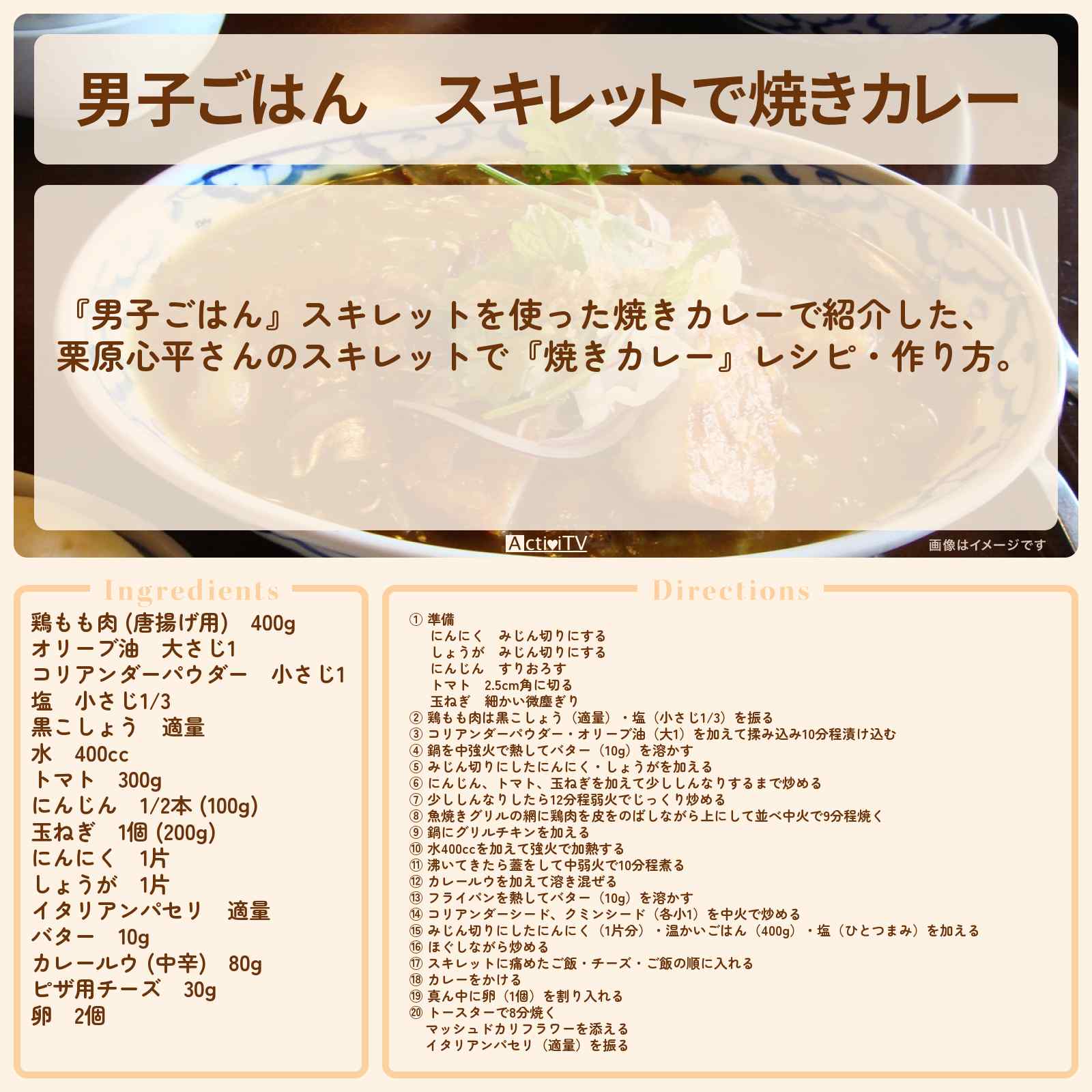 放送の【男子ごはん】スキレットを使った焼きカレーで紹介した、栗原心平さんのスキレットで『焼きカレー』レシピ・作り方。
