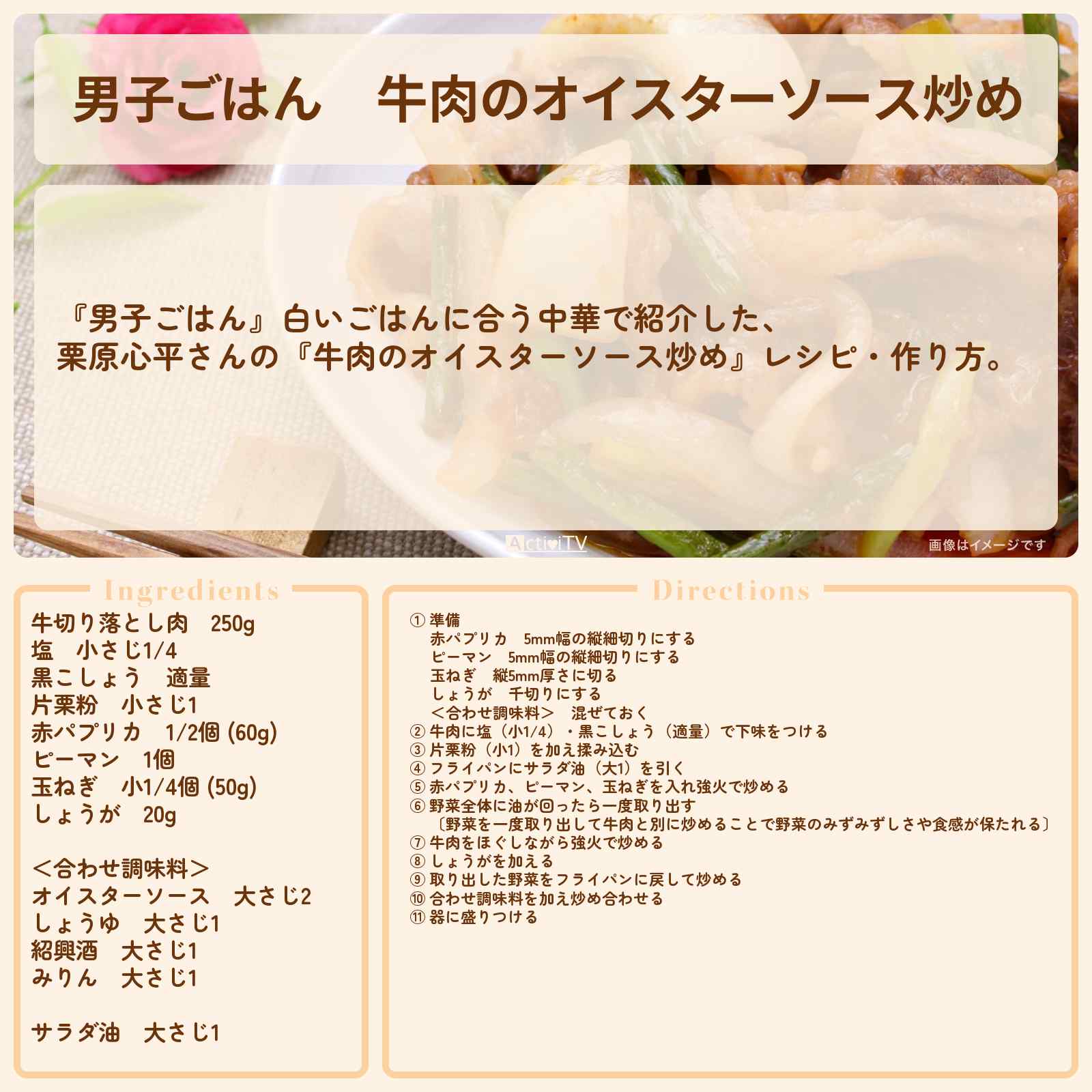 放送の【男子ごはん】白いごはんに合う中華で紹介した、栗原心平さんの『牛肉のオイスターソース炒め』レシピ・作り方。