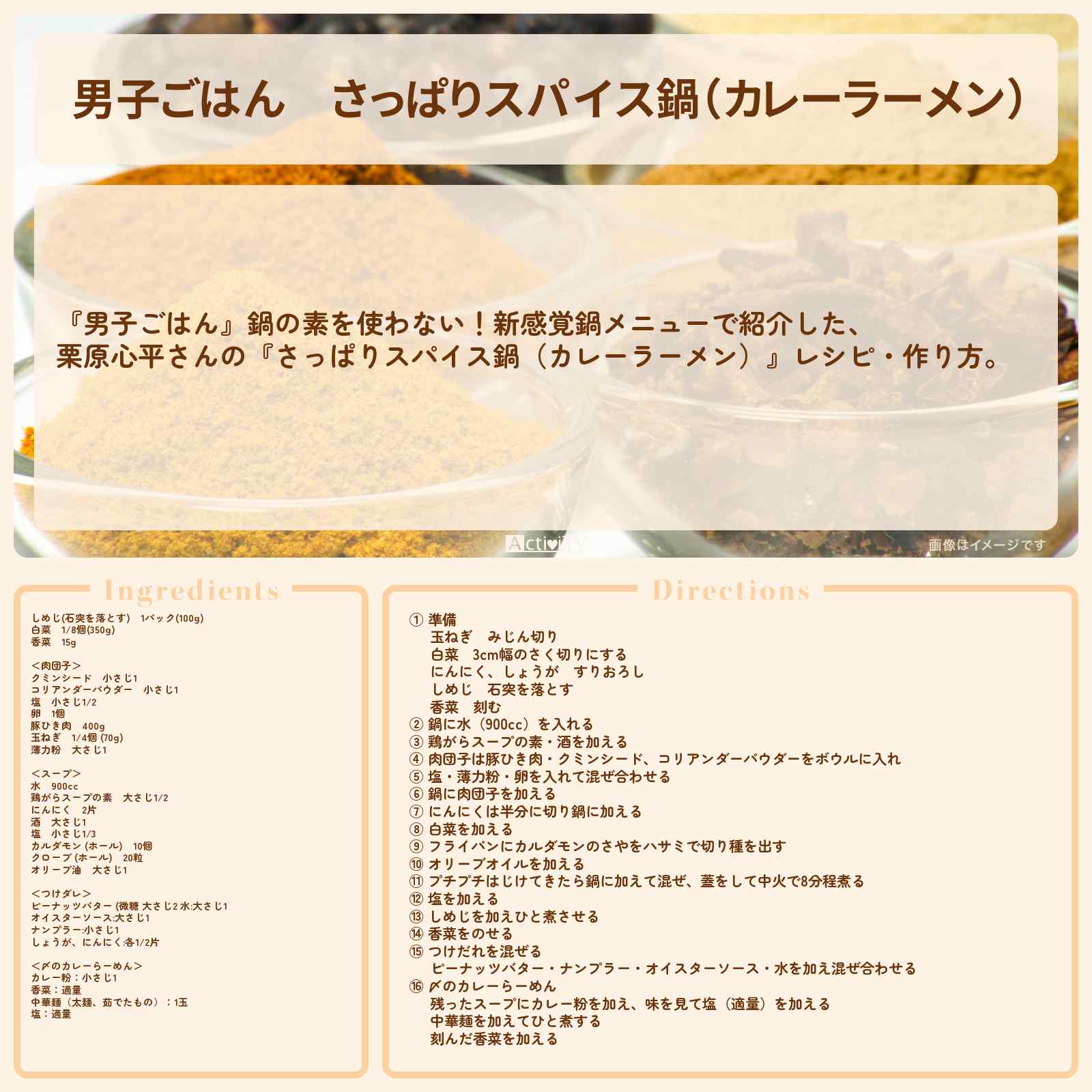 放送の【男子ごはん】鍋の素を使わない!新感覚鍋メニューで紹介した、栗原心平さんの『さっぱりスパイス鍋(カレーラーメン)』レシピ・作り方。