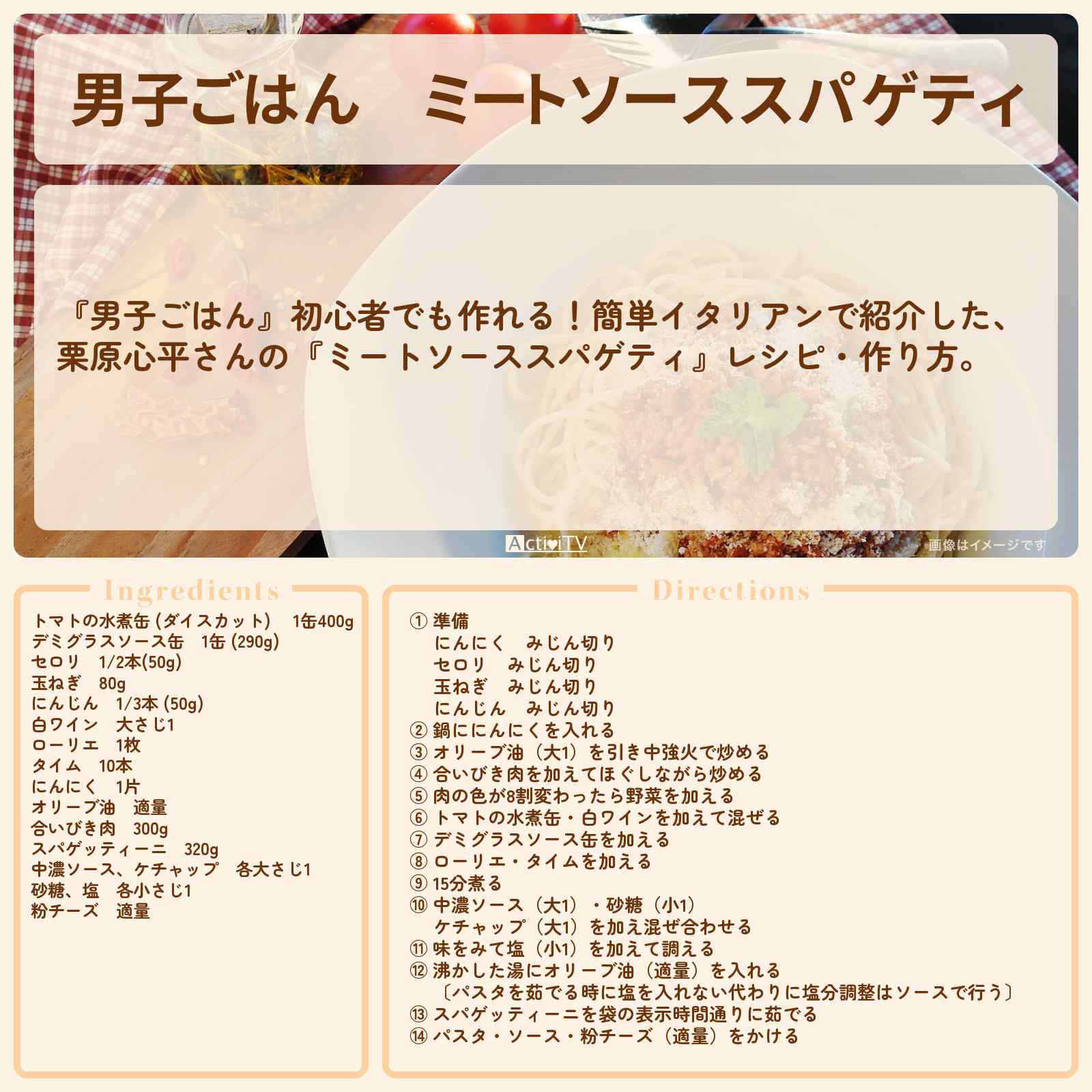 放送の【男子ごはん】初心者でも作れる!簡単イタリアンで紹介した、栗原心平さんの『ミートソーススパゲティ』レシピ・作り方。