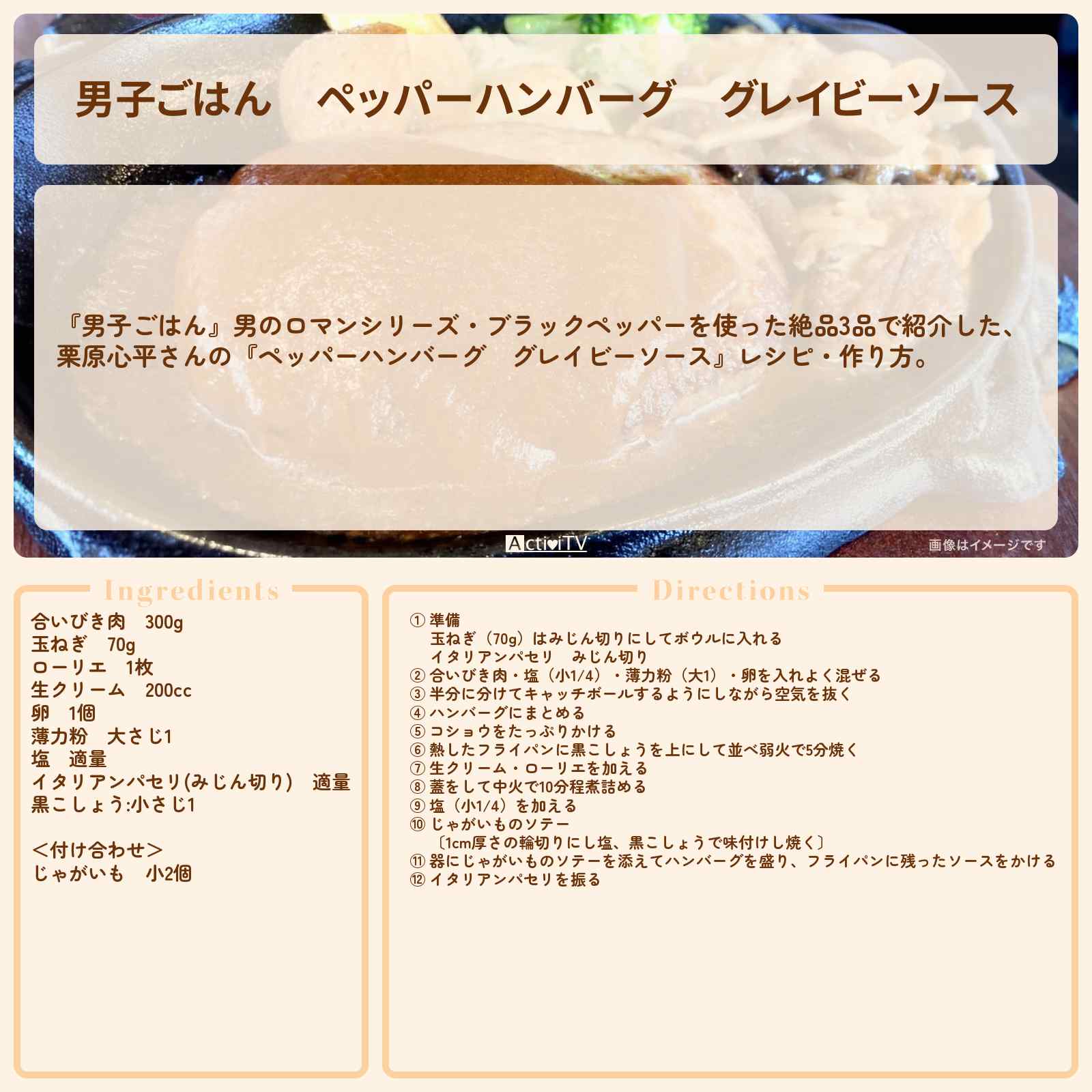 放送の【男子ごはん】男のロマンシリーズ・ブラックペッパーを使った絶品3品で紹介した、栗原心平さんの『ペッパーハンバーグ グレイビーソース』レシピ・作り方。