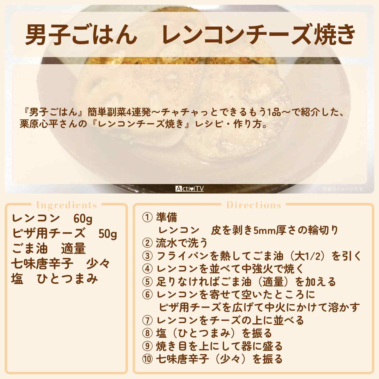 放送の【男子ごはん】簡単副菜4連発〜チャチャっとできるもう1品〜で紹介した、栗原心平さんの『レンコンチーズ焼き』レシピ・作り方。