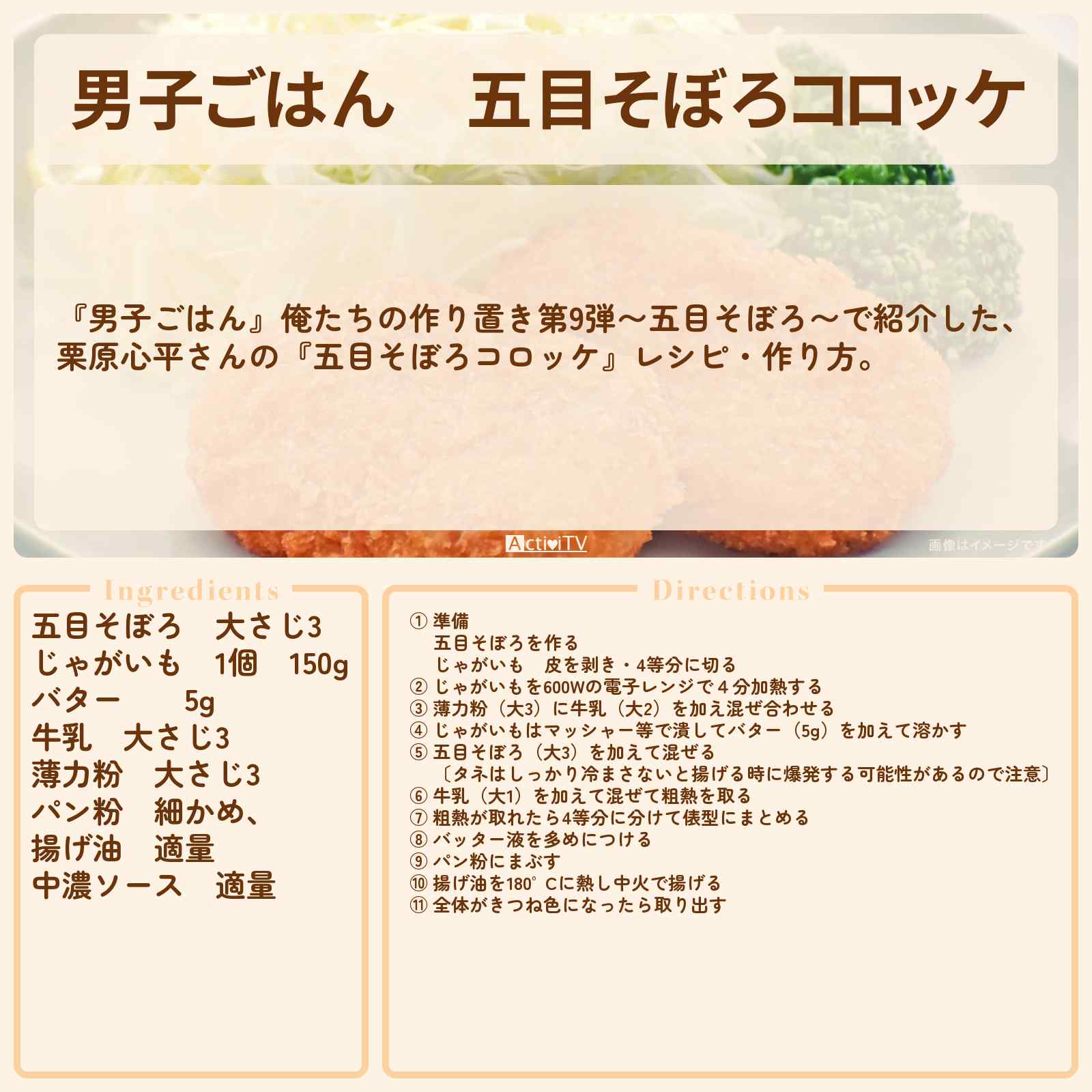 放送の【男子ごはん】俺たちの作り置き第9弾〜五目そぼろ〜で紹介した、栗原心平さんの『五目そぼろコロッケ』レシピ・作り方。