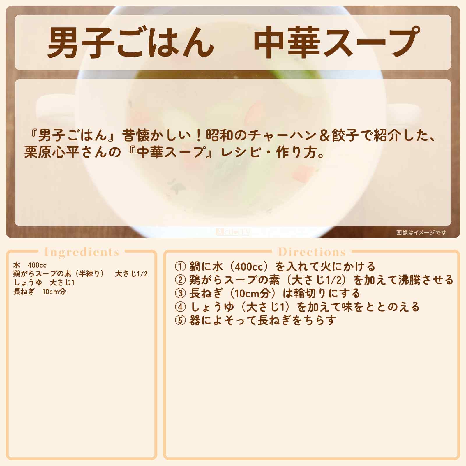 放送の【男子ごはん】昔懐かしい!昭和のチャーハン&餃子で紹介した、栗原心平さんの『中華スープ』レシピ・作り方。