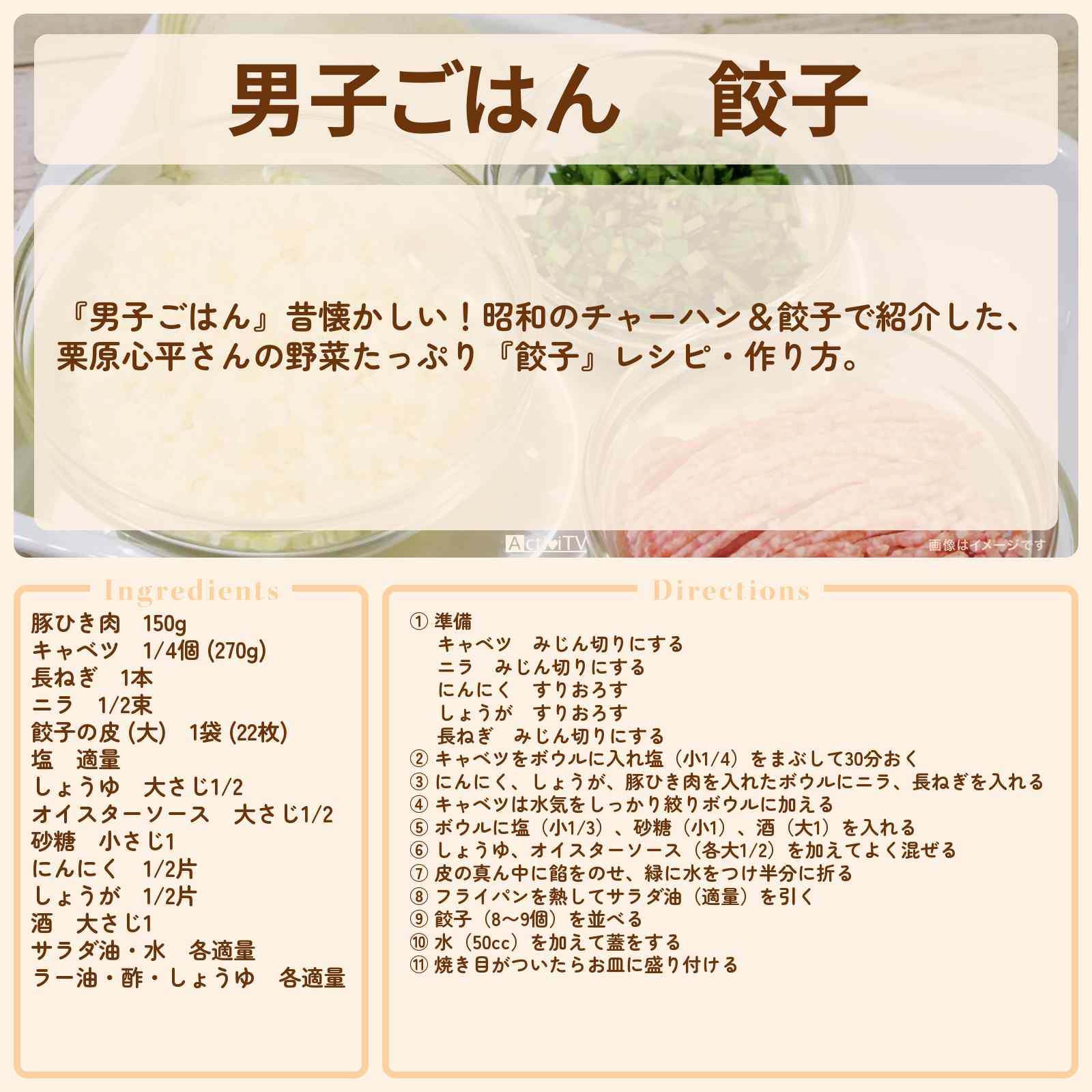 放送の【男子ごはん】昔懐かしい!昭和のチャーハン&餃子で紹介した、栗原心平さんの野菜たっぷり『餃子』レシピ・作り方。