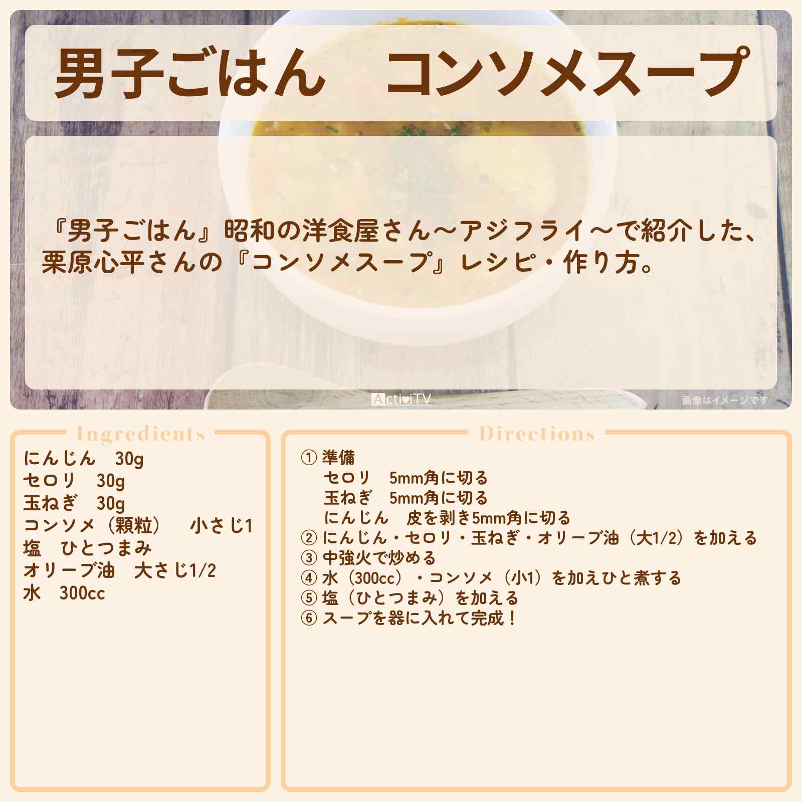 放送の【男子ごはん】昭和の洋食屋さん〜アジフライ〜で紹介した、栗原心平さんの『コンソメスープ』レシピ・作り方。