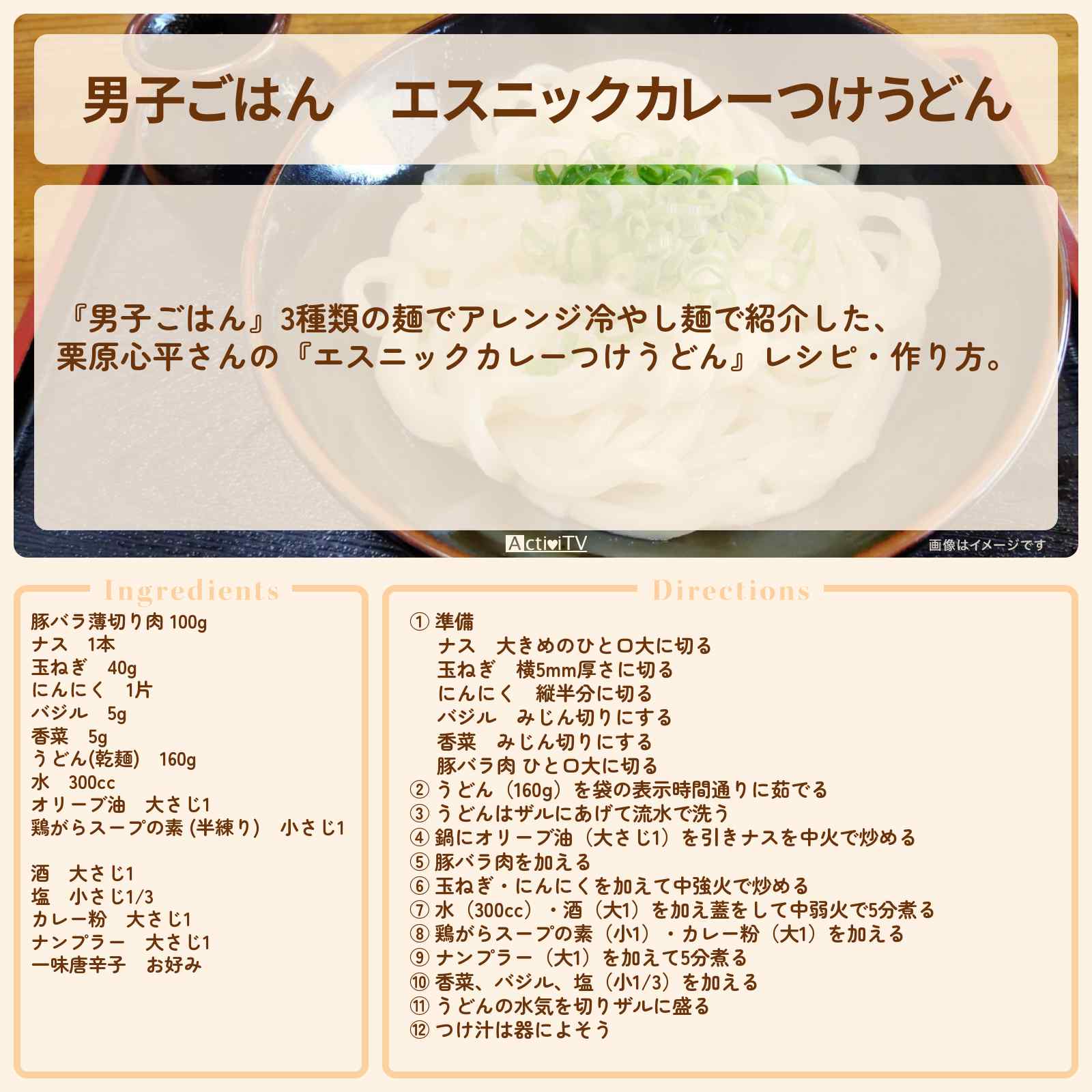 放送の【男子ごはん】3種類の麺でアレンジ冷やし麺で紹介した、栗原心平さんの『エスニックカレーつけうどん』レシピ・作り方。