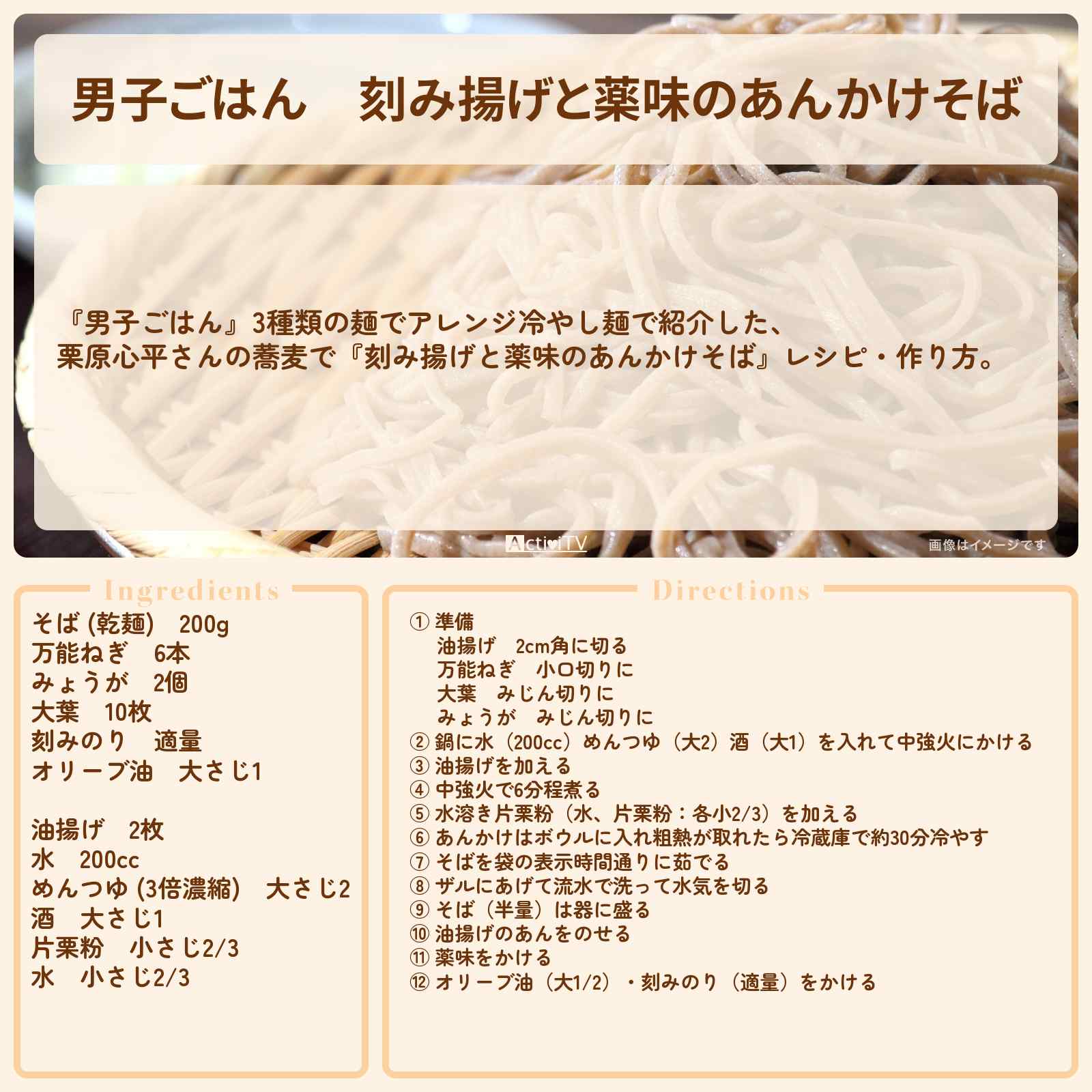放送の【男子ごはん】3種類の麺でアレンジ冷やし麺で紹介した、栗原心平さんの蕎麦で『刻み揚げと薬味のあんかけそば』レシピ・作り方。