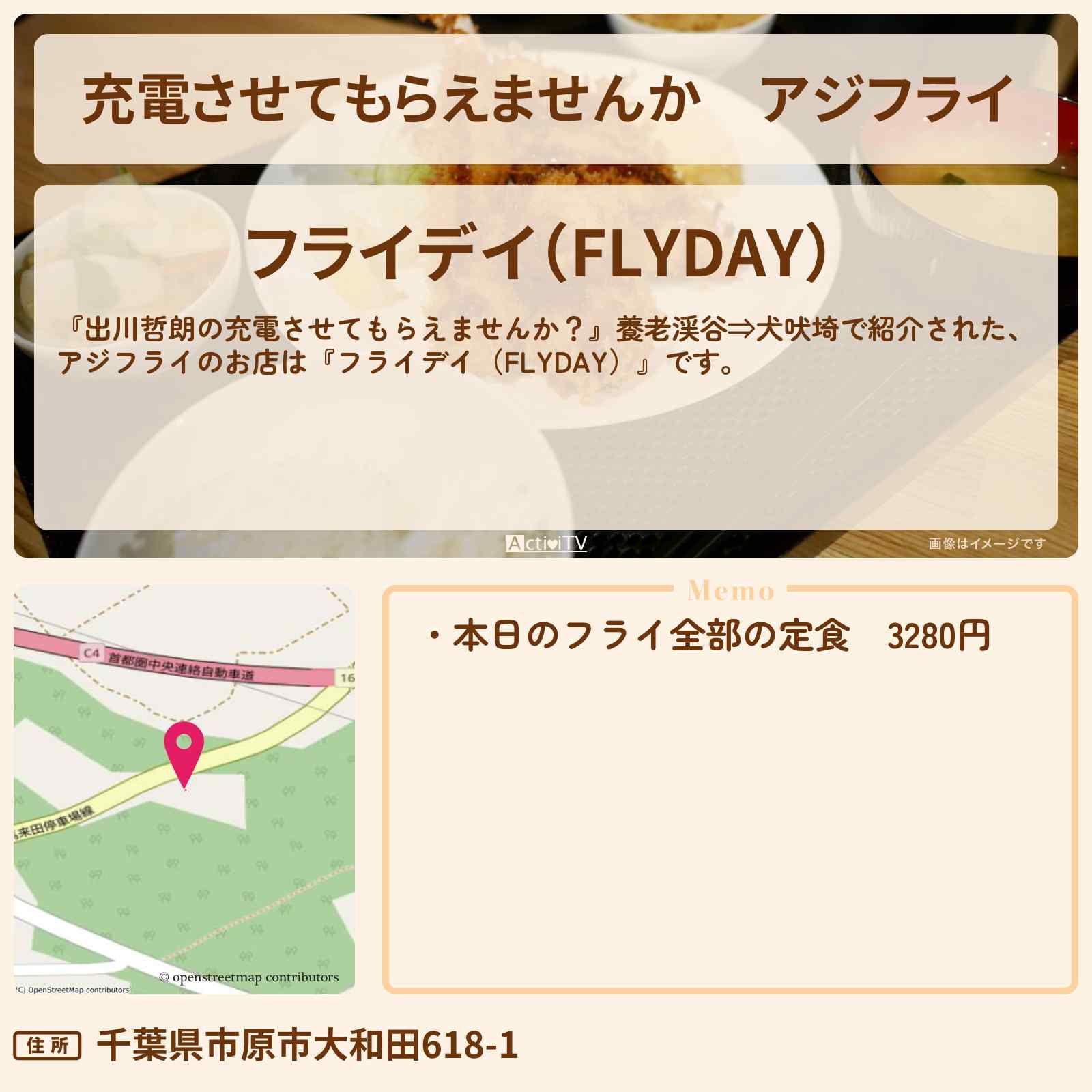 放送の【出川哲朗の充電させてもらえませんか?】養老渓谷⇒犬吠埼で紹介された、アジフライのお店は『フライデイ(FLYDAY)』です。