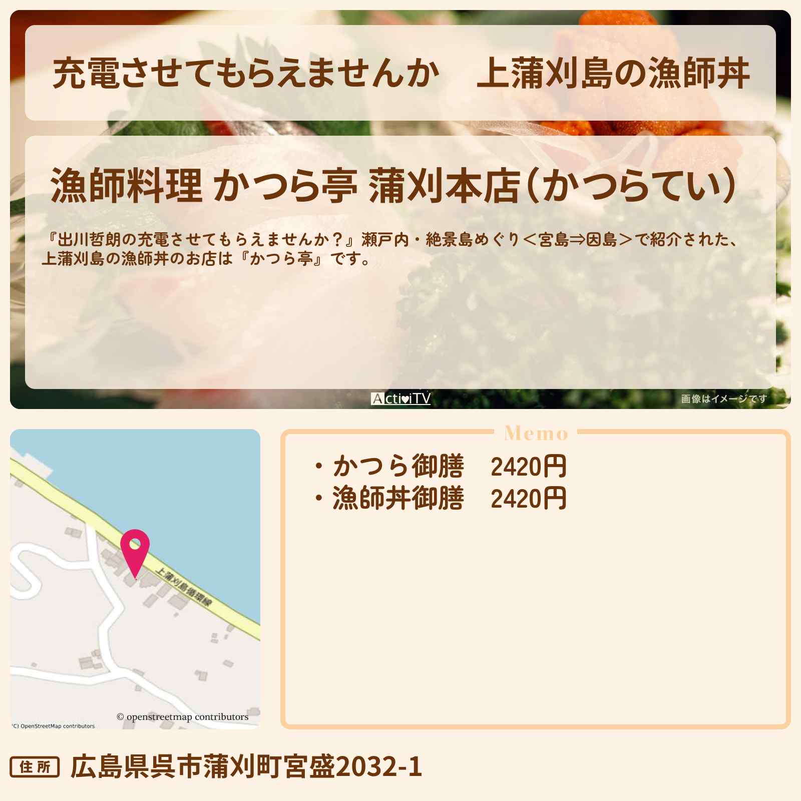 放送の【出川哲朗の充電させてもらえませんか?】瀬戸内・絶景島めぐり<宮島⇒因島>で紹介された、上蒲刈島の漁師丼のお店は『かつら亭』です。