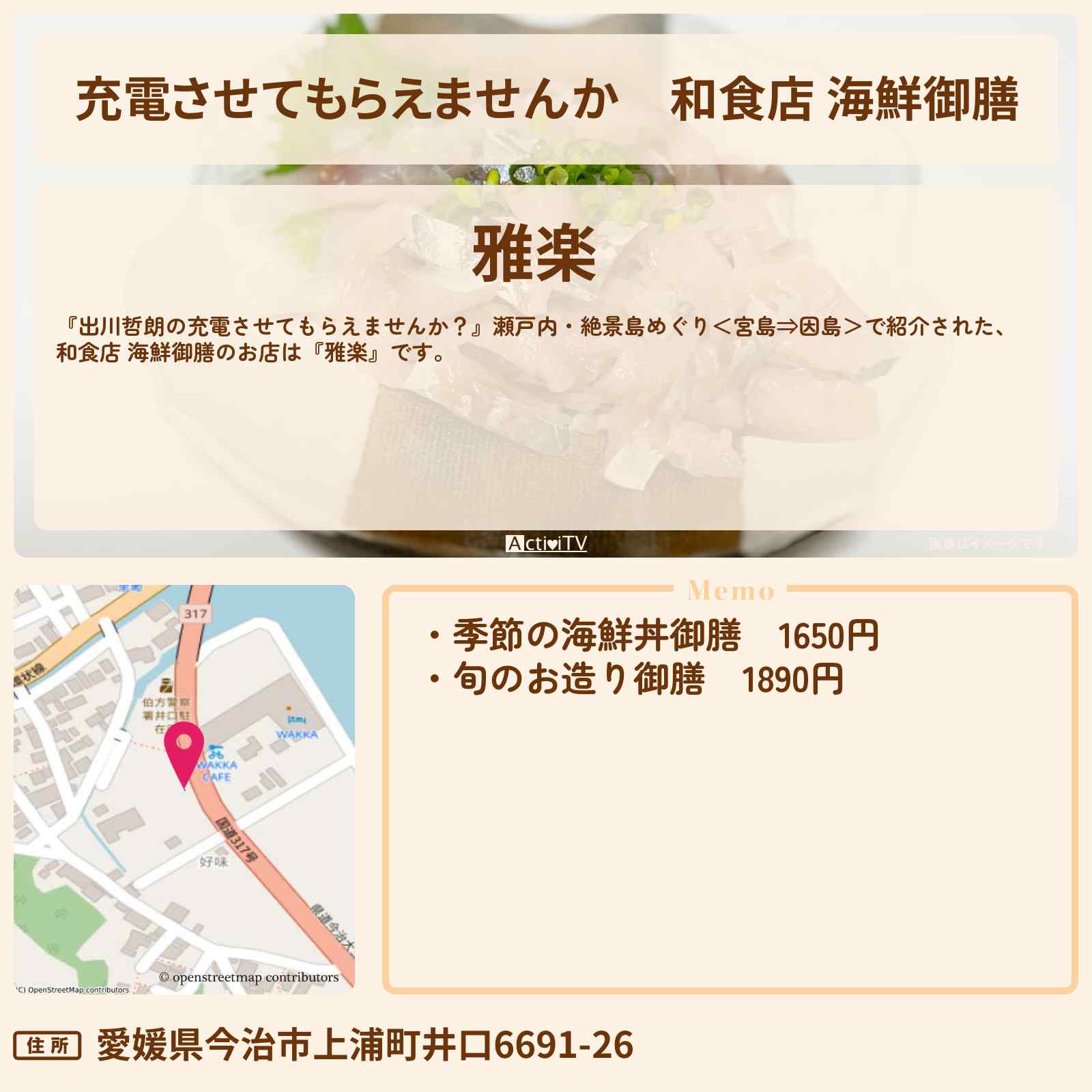放送の【出川哲朗の充電させてもらえませんか?】瀬戸内・絶景島めぐり<宮島⇒因島>で紹介された、和食店 海鮮御膳のお店は『雅楽』です。