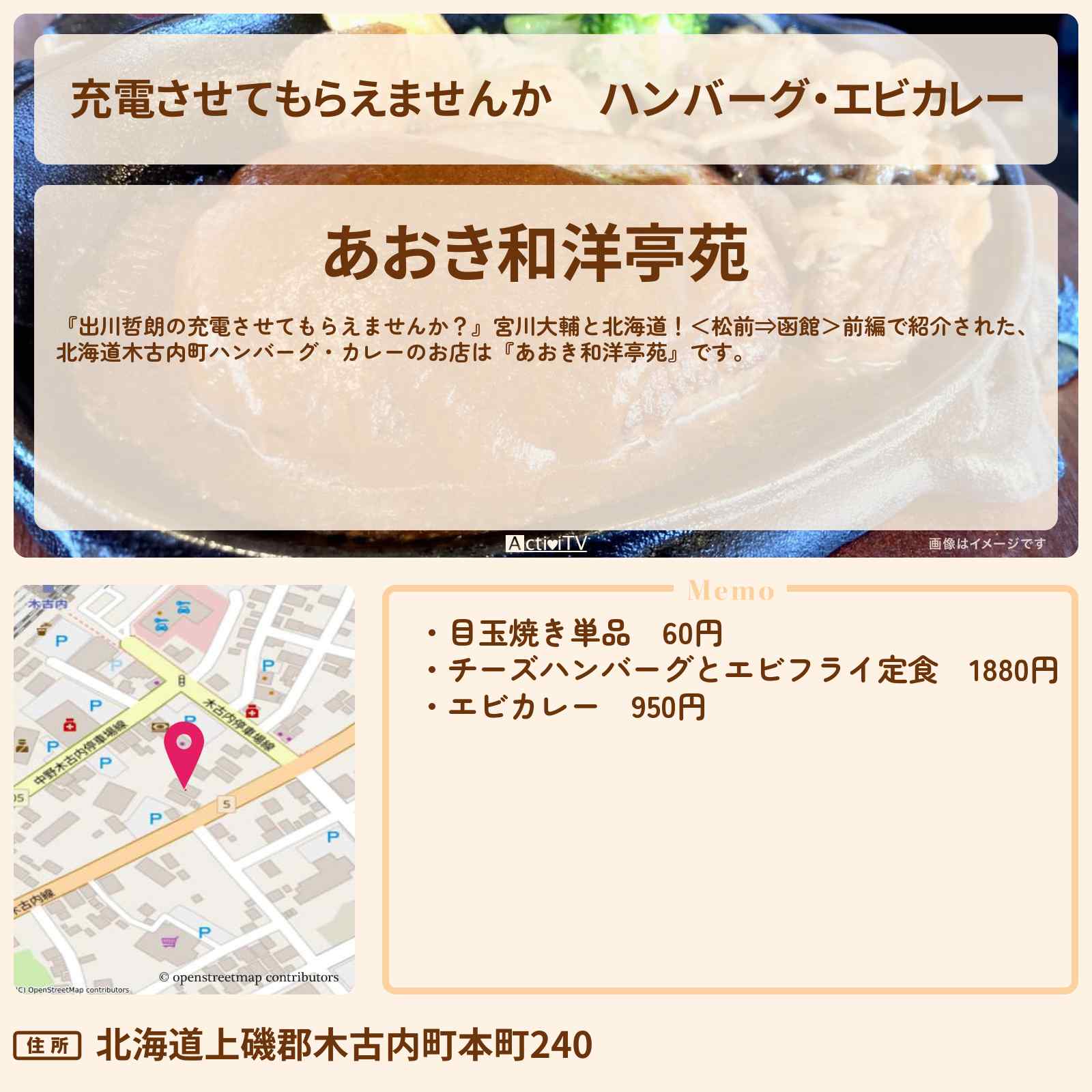 放送の【出川哲朗の充電させてもらえませんか?】宮川大輔と北海道!<松前⇒函館>前編で紹介された、北海道木古内町ハンバーグ・カレーのお店は『あおき和洋亭苑』です。