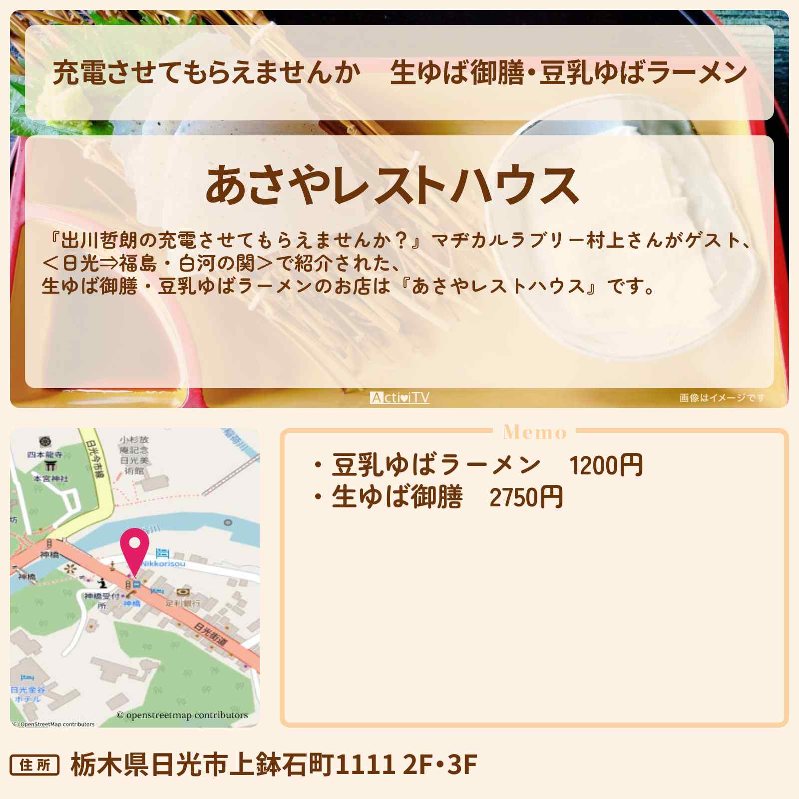 放送の【出川哲朗の充電させてもらえませんか?】マヂカルラブリー村上さんがゲスト、<日光⇒福島・白河の関>で紹介された、生ゆば御膳・豆乳ゆばラーメンのお店は『あさやレストハウス』です。