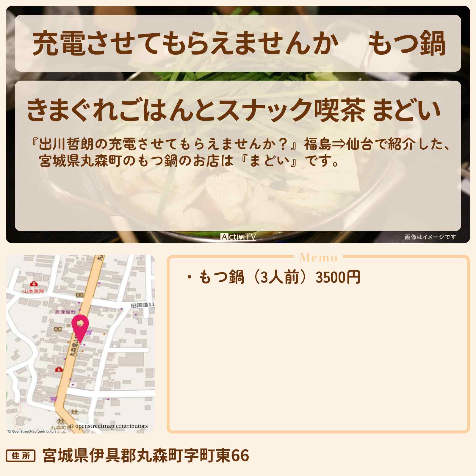 放送の【出川哲朗の充電させてもらえませんか?】福島⇒仙台で紹介した、 宮城県丸森町のもつ鍋のお店は『まどい』です。
