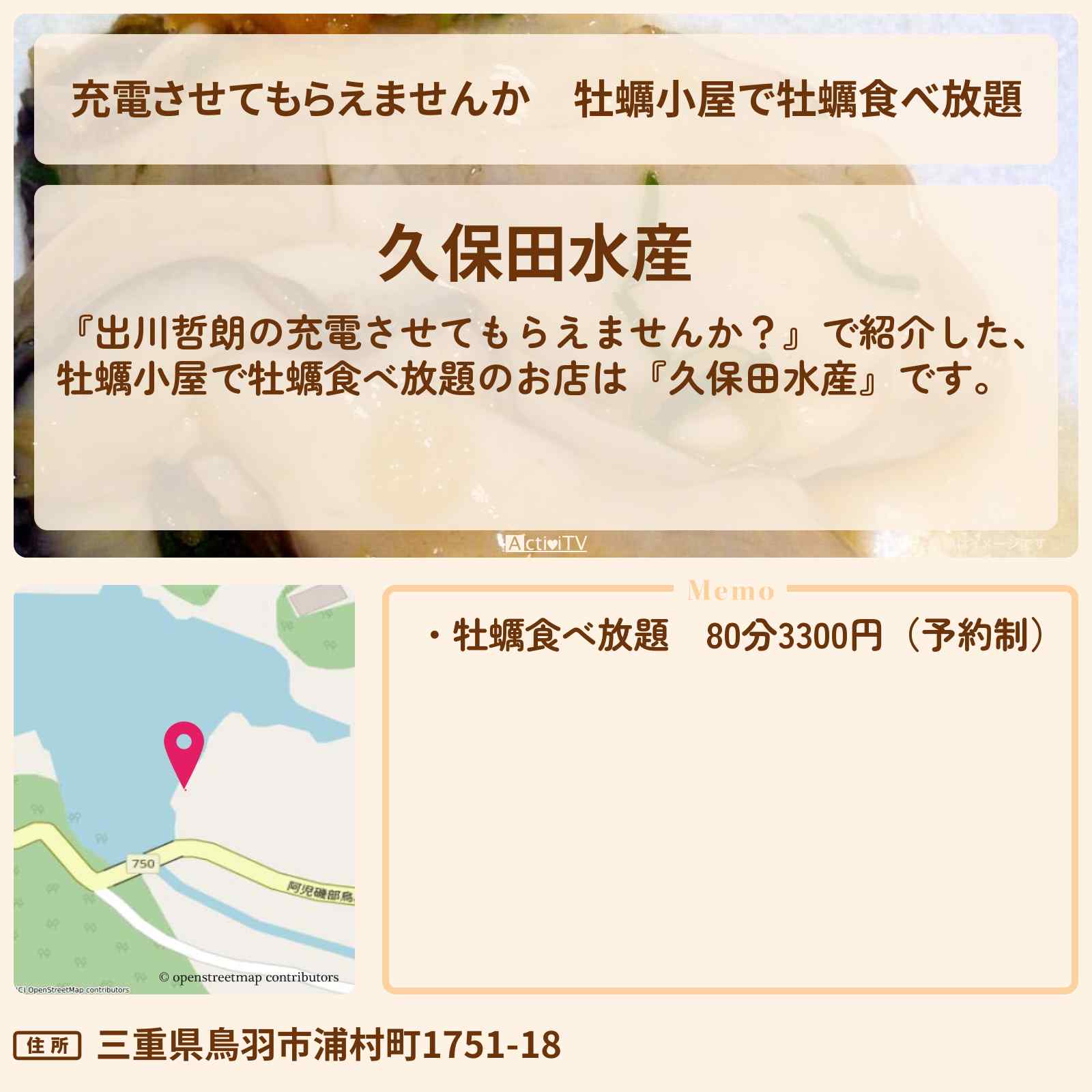 放送の【出川哲朗の充電させてもらえませんか?】で紹介した、牡蠣小屋で牡蠣食べ放題のお店は『久保田水産』です。