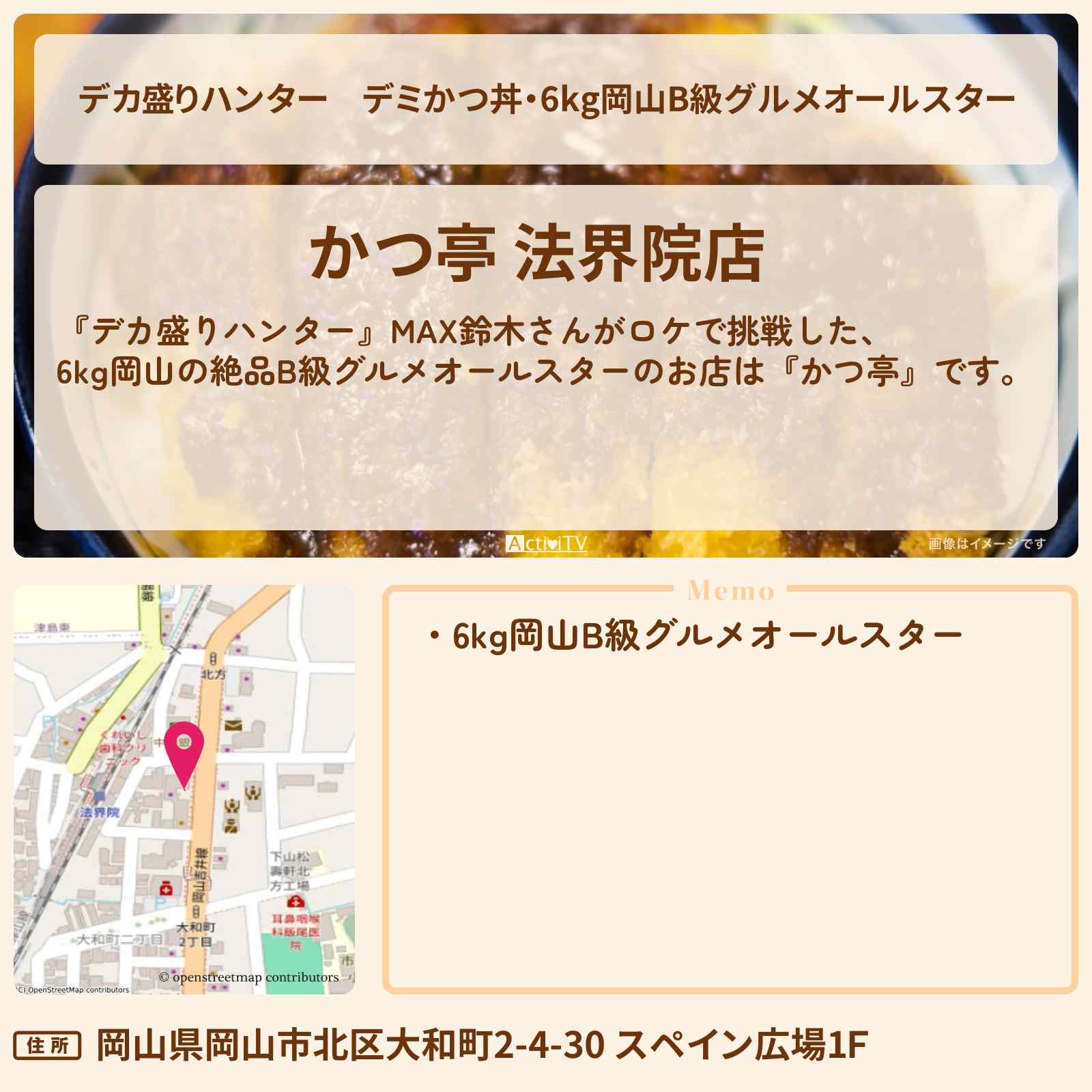 放送の【デカ盛りハンター】MAX鈴木さんがロケで挑戦した、6kg岡山の絶品B級グルメオールスターのお店は『かつ亭』です。
