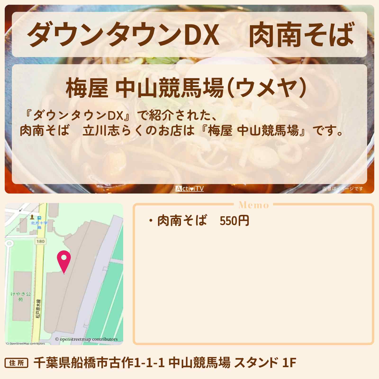放送の【ダウンタウンDX】で紹介された、肉南そば 立川志らくのお店は『梅屋 中山競馬場』です。