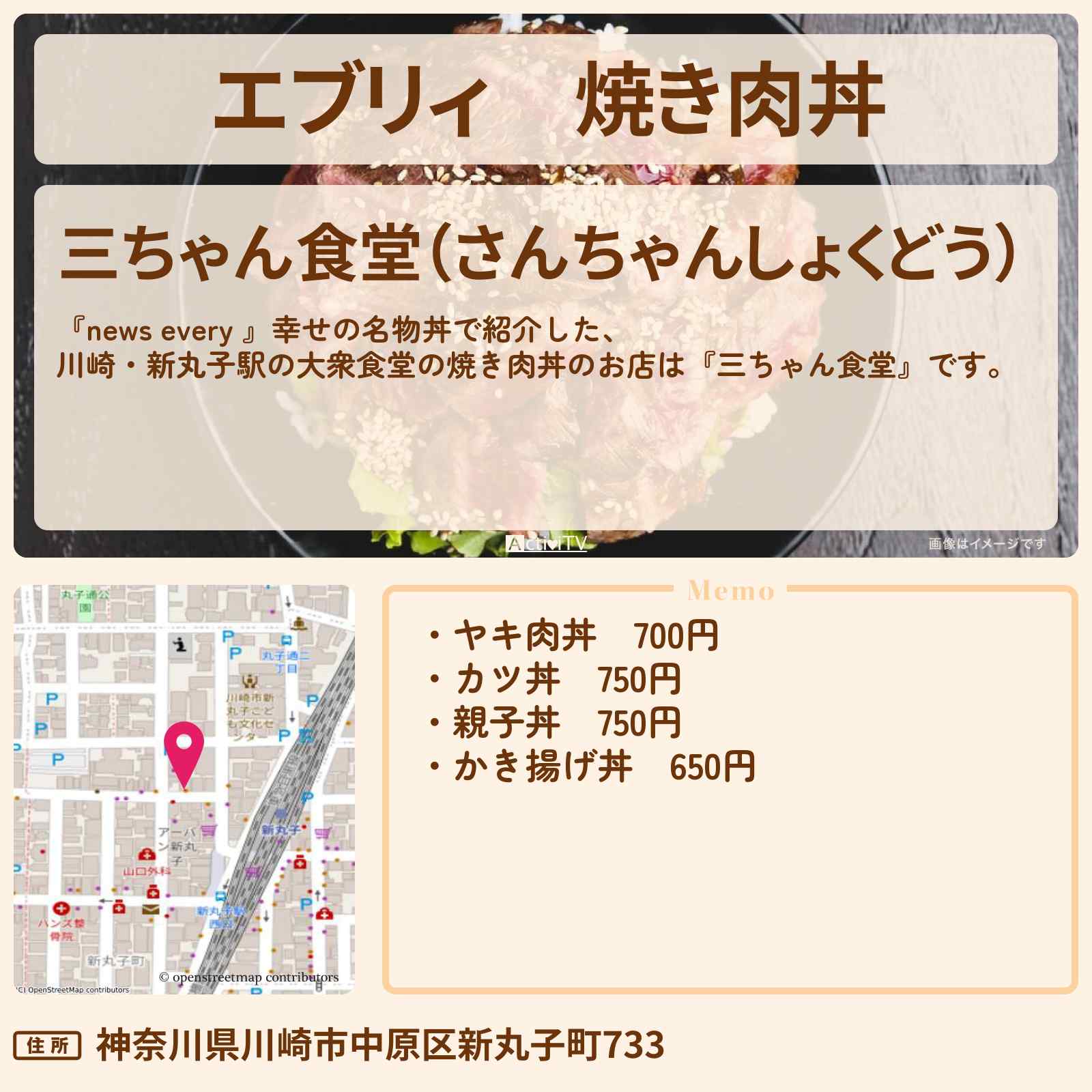 放送の【news every 】幸せの名物丼で紹介した、川崎・新丸子駅の大衆食堂の焼き肉丼のお店は『三ちゃん食堂』です。