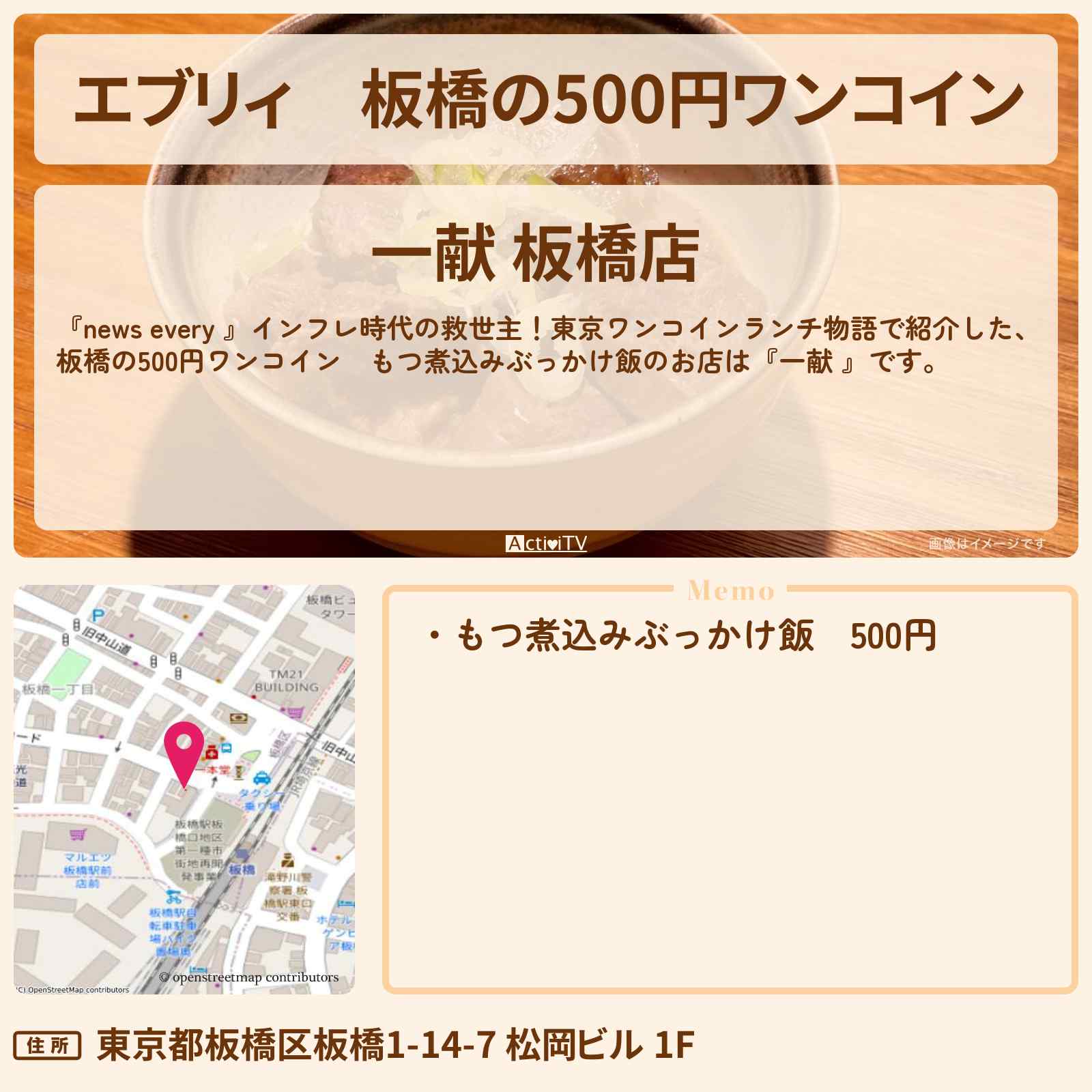 | 住所 | 東京都板橋区板橋1-14-7 松岡ビル 1F |