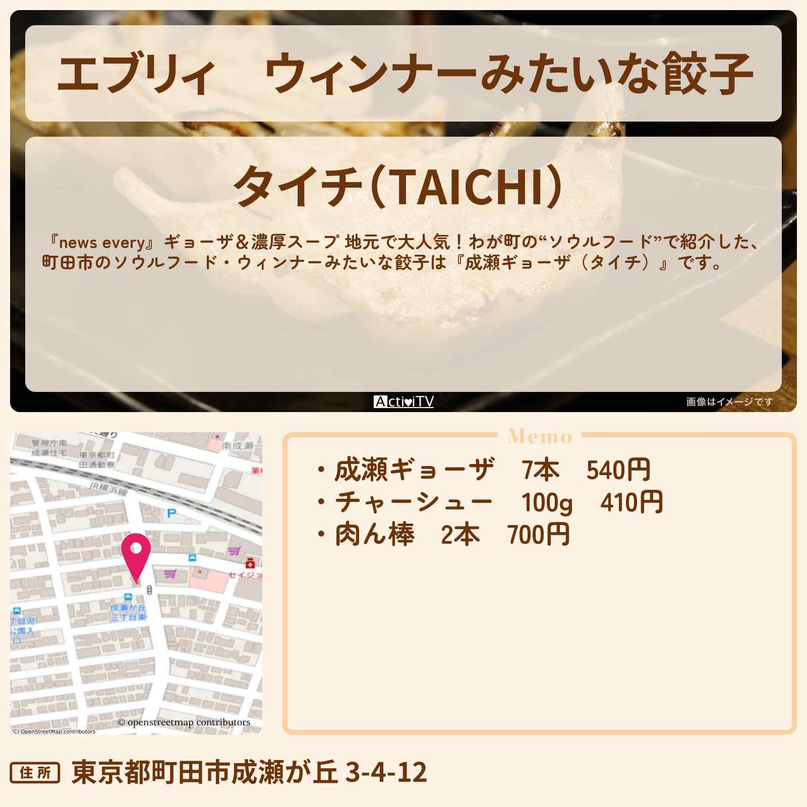 放送の【news every】ギョーザ&濃厚スープ 地元で大人気!わが町の“ソウルフード”で紹介した、町田市のソウルフード・ウィンナーみたいな餃子は『成瀬ギョーザ(タイチ)』です。
