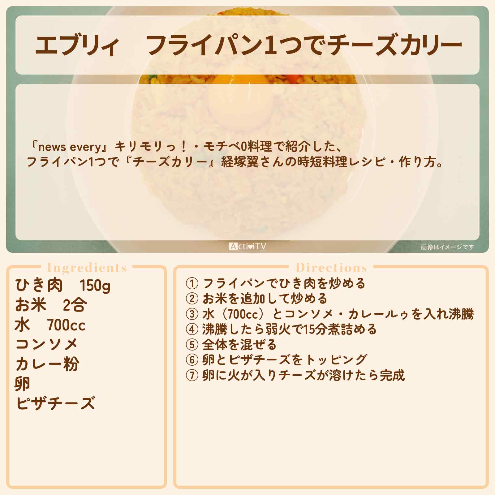 放送の【news every】キリモリっ!・モチベ0料理で紹介した、フライパン1つで『チーズカリー』経塚翼さんの時短料理レシピ・作り方。