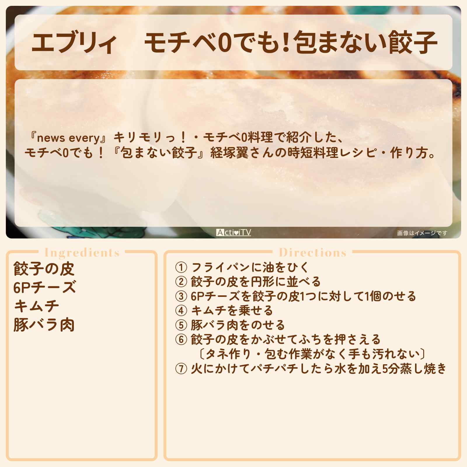 放送の【news every】キリモリっ!・モチベ0料理で紹介した、モチベ0でも!『包まない餃子』経塚翼さんの時短料理レシピ・作り方。