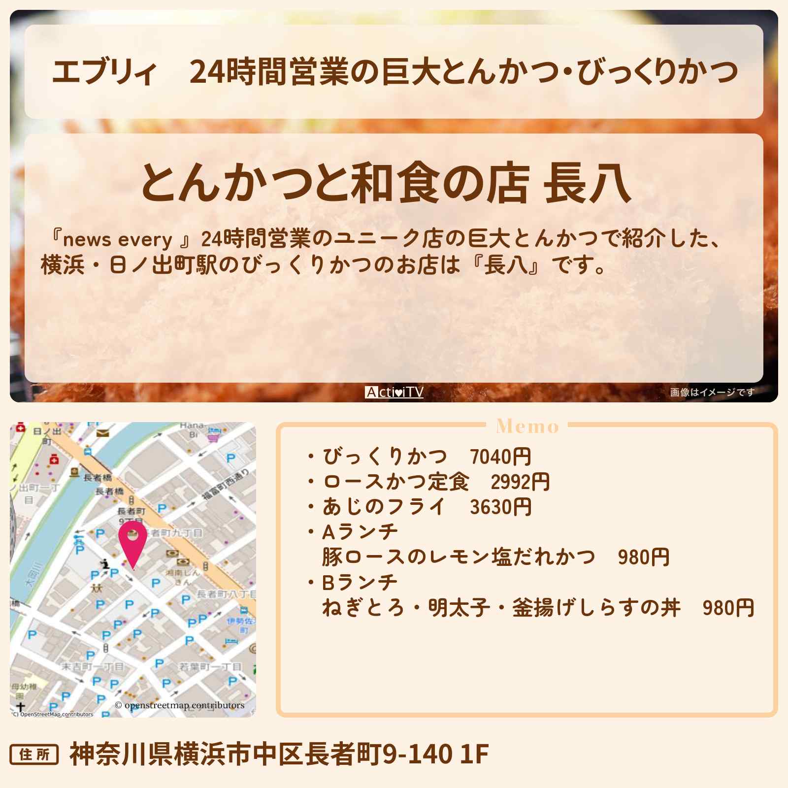 放送の【news every 】24時間営業のユニーク店の巨大とんかつで紹介した、横浜・日ノ出町駅のびっくりかつのお店は『長八』です。