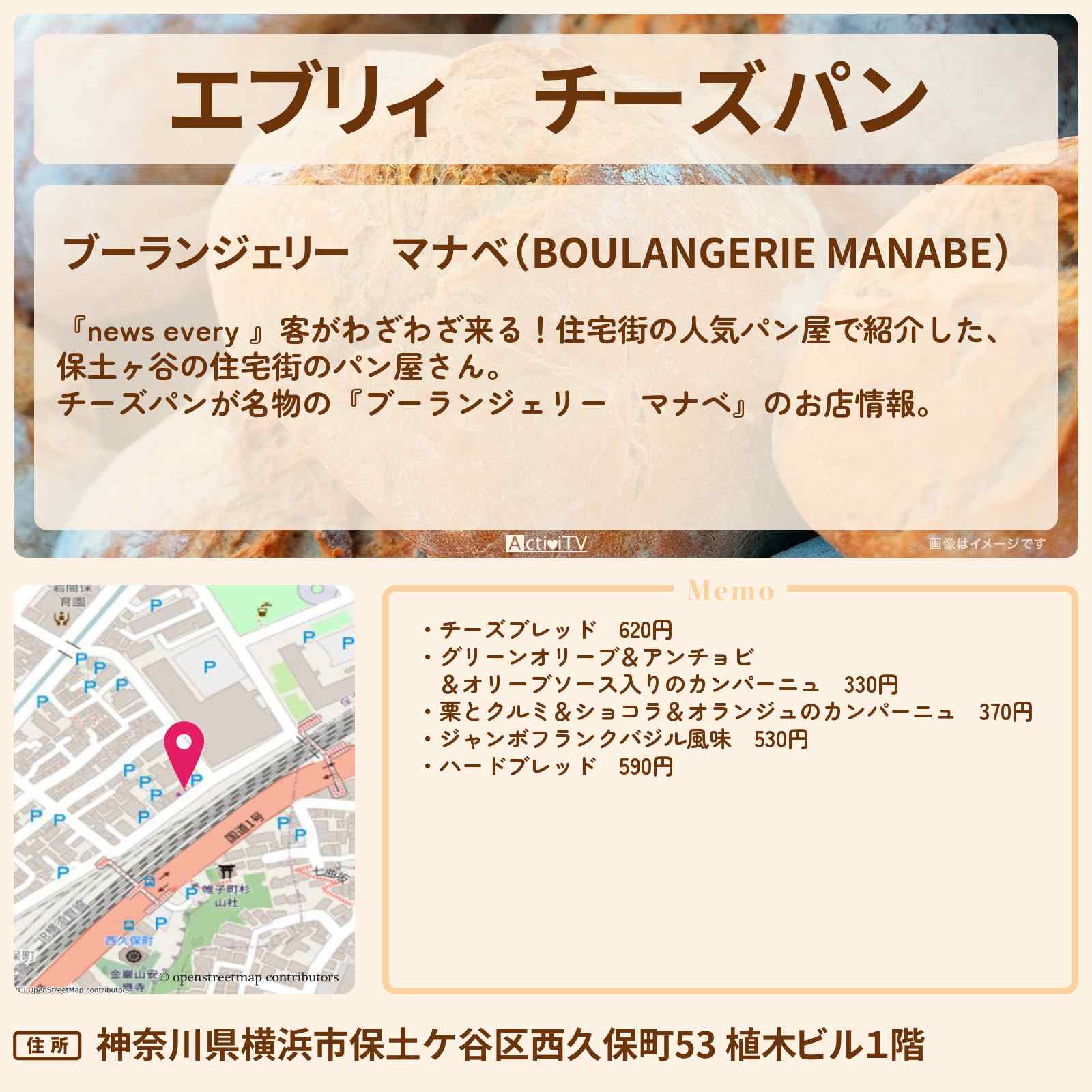 放送の【news every 】客がわざわざ来る!住宅街の人気パン屋で紹介した、保土ヶ谷の住宅街のパン屋さん。チーズパンが名物の『ブーランジェリー マナベ』のお店情報。