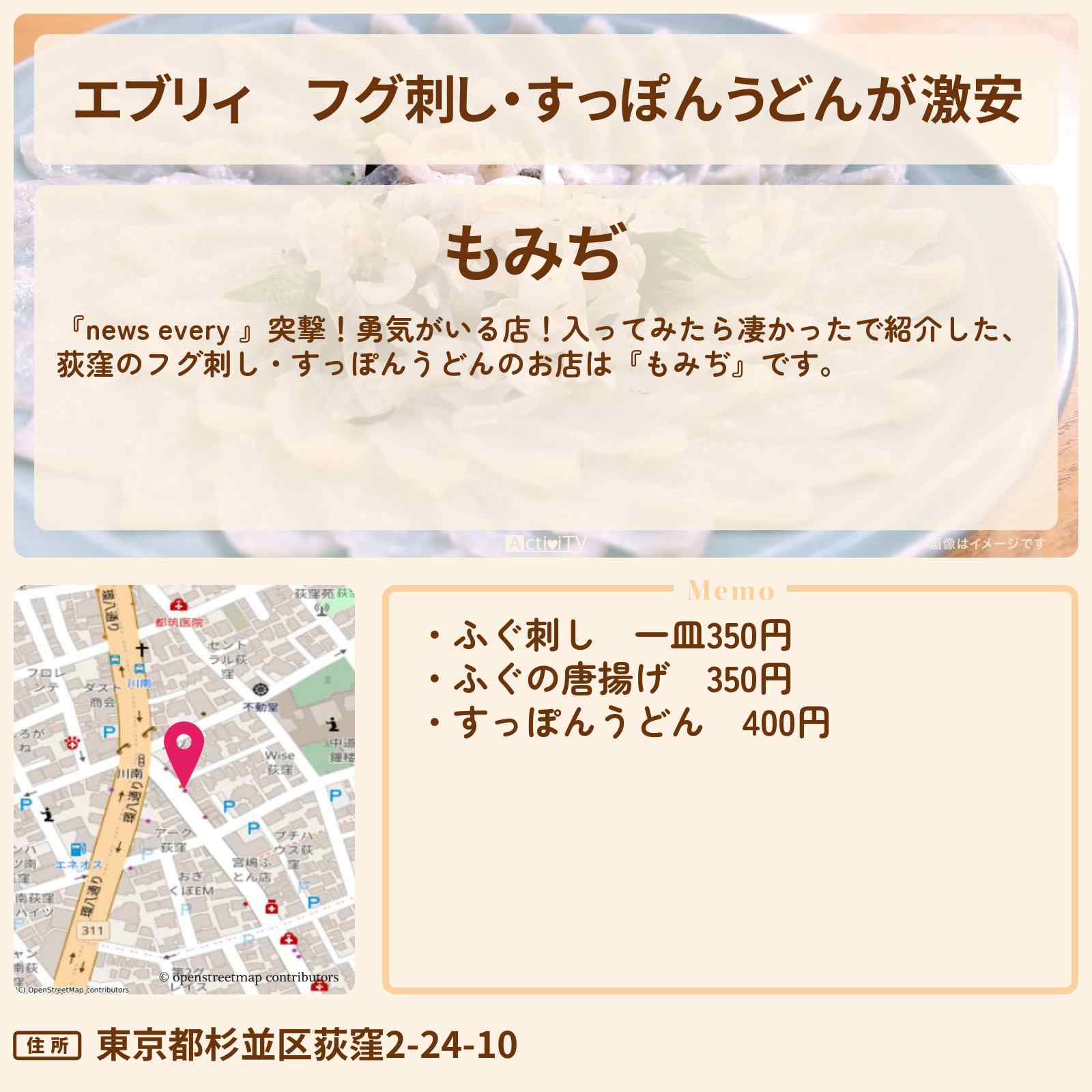 【エブリィ】フグ刺し・すっぽんうどんが激安 荻窪『もみぢ』のお店情報 #every