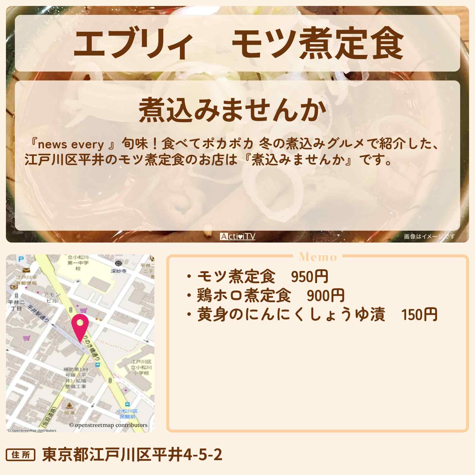 放送の【news every 】旬味!食べてポカポカ 冬の煮込みグルメで紹介した、江戸川区平井のモツ煮定食のお店は『煮込みませんか』です。