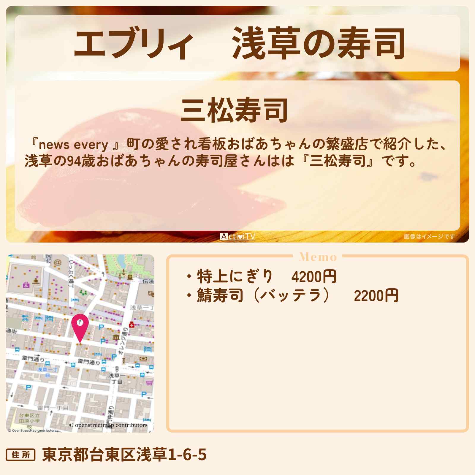 放送の【news every 】町の愛され看板おばあちゃんの繁盛店で紹介した、浅草の94歳おばあちゃんの寿司屋さんはは『三松寿司』です。