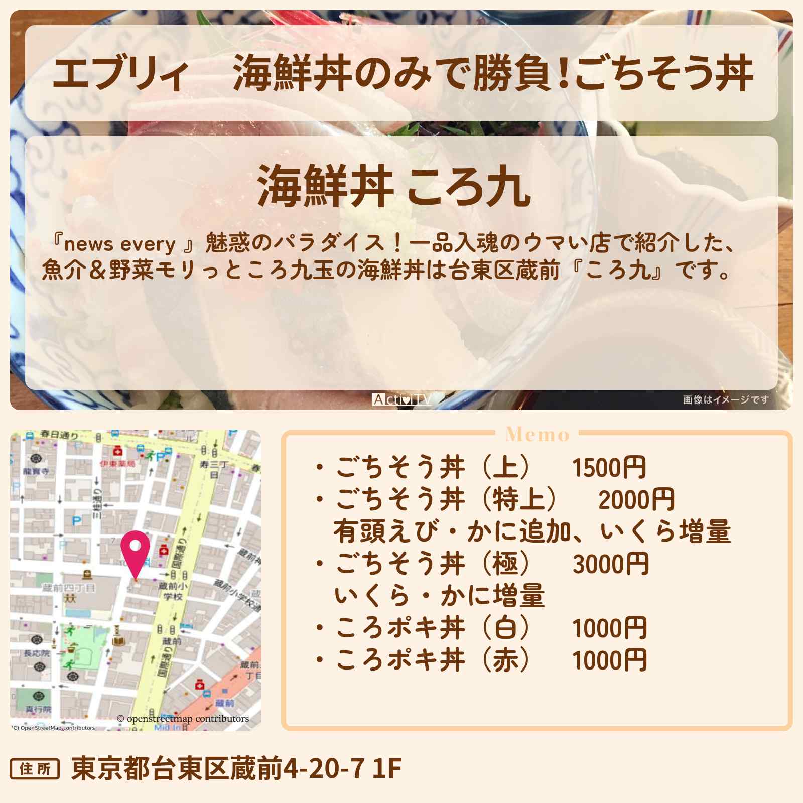 海鮮丼 ころ九(蔵前/和食/日本料理・懐石・割烹)の店舗情報・予約なら、お得なクーポン満載【ホットペッパーグルメ】!海鮮丼 ころ九のおすすめポイントは、新鮮なこだわり具材9種の海鮮丼。濃厚な鯛だし付きで、〆の鯛だし茶漬けまで、満足感いっぱいです! お持ち帰りでも新鮮な味をお届けします!。海鮮丼 ころ九の地図、メニュー、口コミ、写真などグルメ情報満載です!…