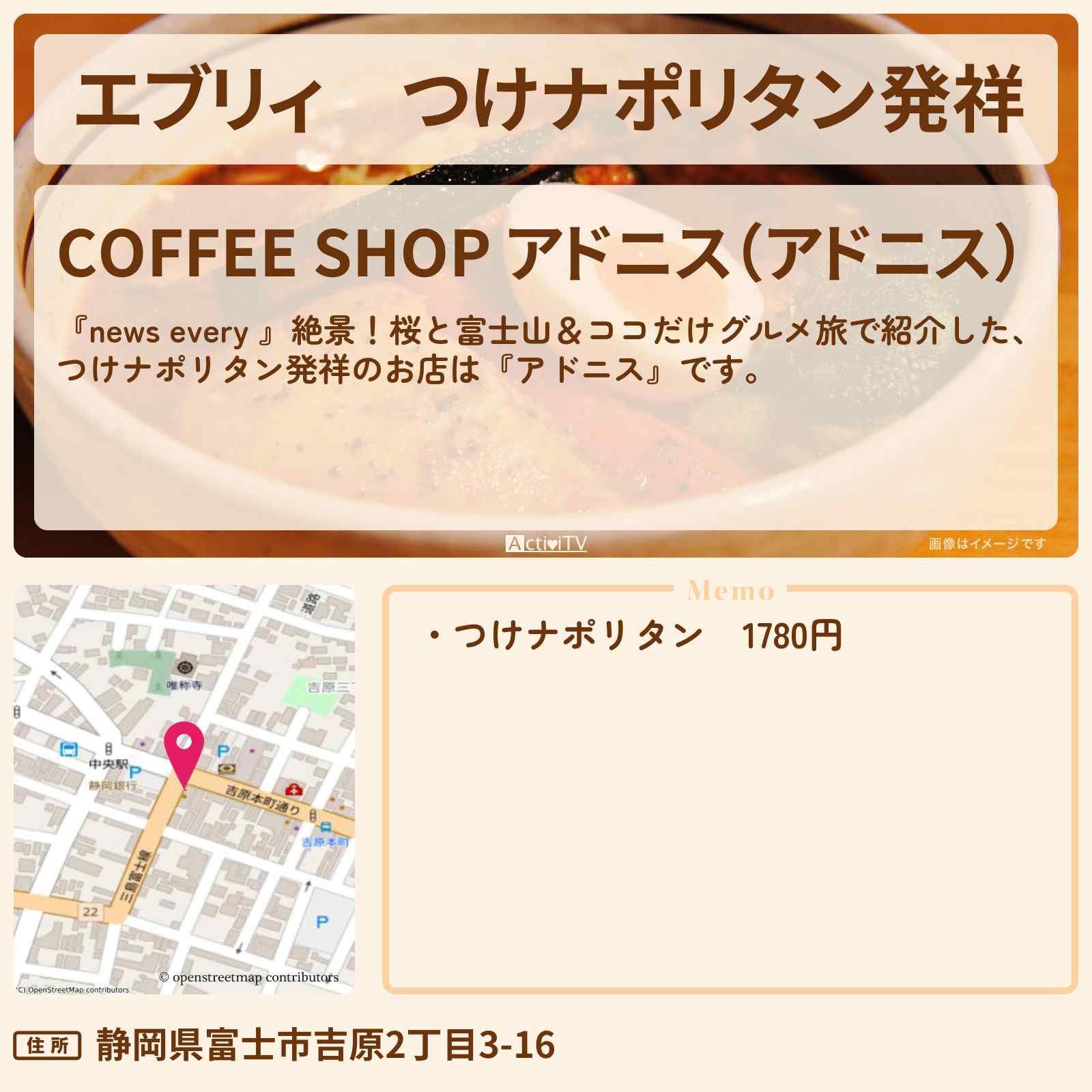 [カフェ好き人気店☆] こちらは『CoffeeShop アドニス(富士/カフェ)』のお店ページです。実名でのオススメが31件集まっています。Rettyで食が好きなグルメな人たちからお店を探そう!…